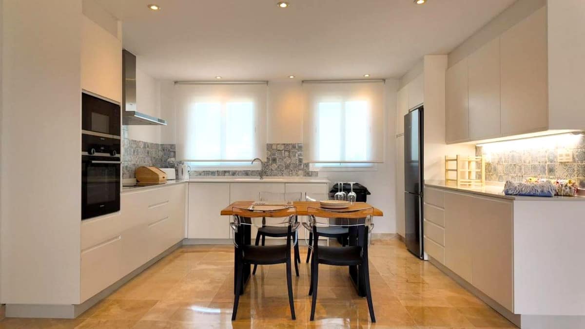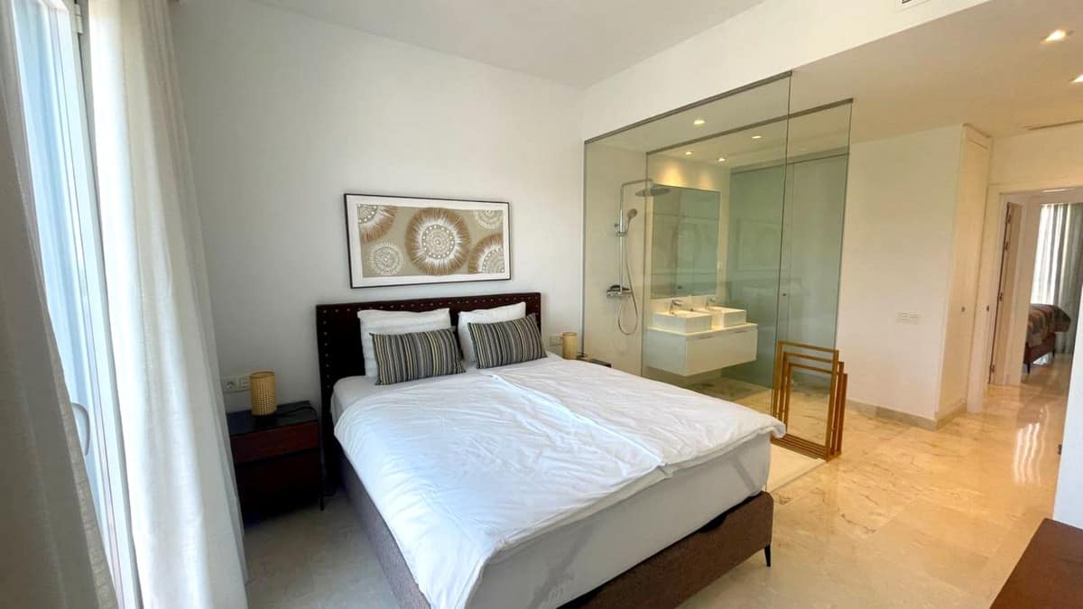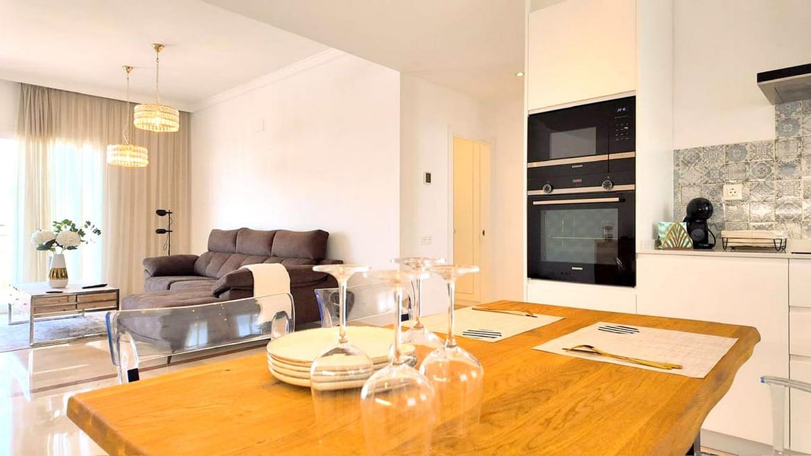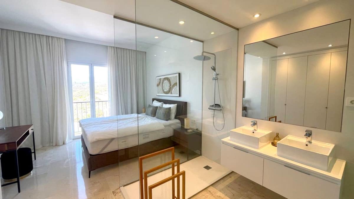 This spacious 2-bedroom penthouse, 2-bathroom apartment exudes warmth and elegance. The interior features a bright open-plan living and dining area connected to a fully equipped modern kitchen with high-quality appliances. Large windows and a private terrace allow plenty of natural light and offer beautiful views of the surrounding mountains, sea views and Mediterranean landscape.