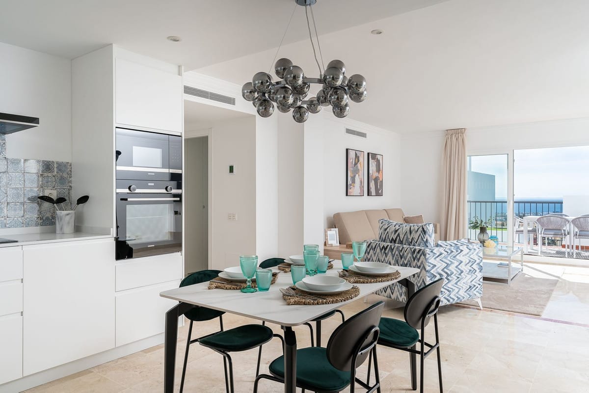 This spacious 2-bedroom penthouse, 2-bathroom apartment exudes warmth and elegance. The interior features a bright open-plan living and dining area connected to a fully equipped modern kitchen with high-quality appliances. Large windows and a private terrace allow plenty of natural light and offer beautiful views of the surrounding mountains and Mediterranean landscape.