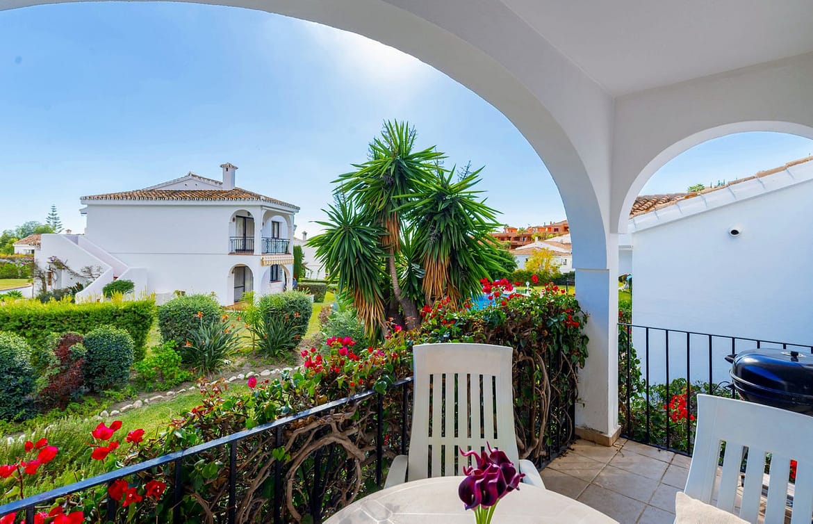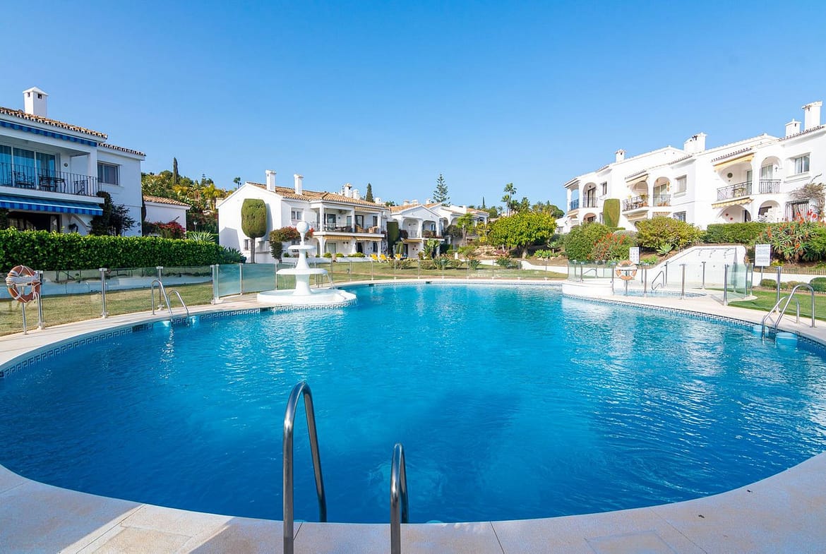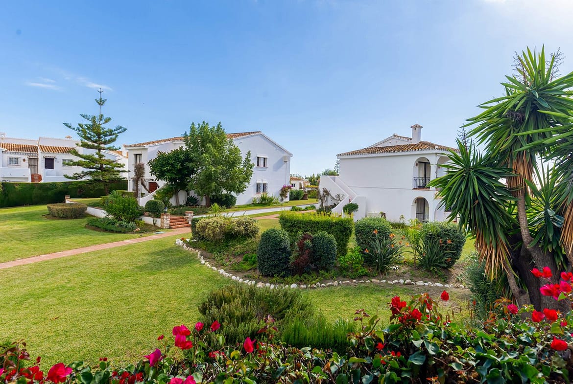 The community offers a well maintained residents swimming pool and tropical palm gardens expertly decorated with tall palm trees, colourful bougainvillea and Andalucían Roman garden features, designed within its exquisite tiled pathways decorating the community throughout.