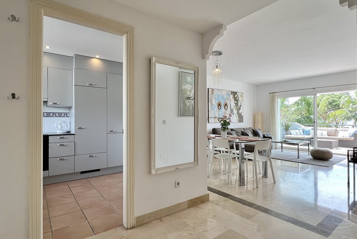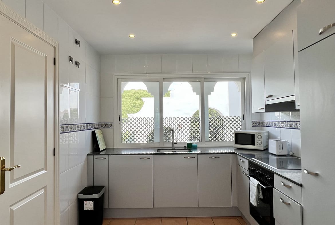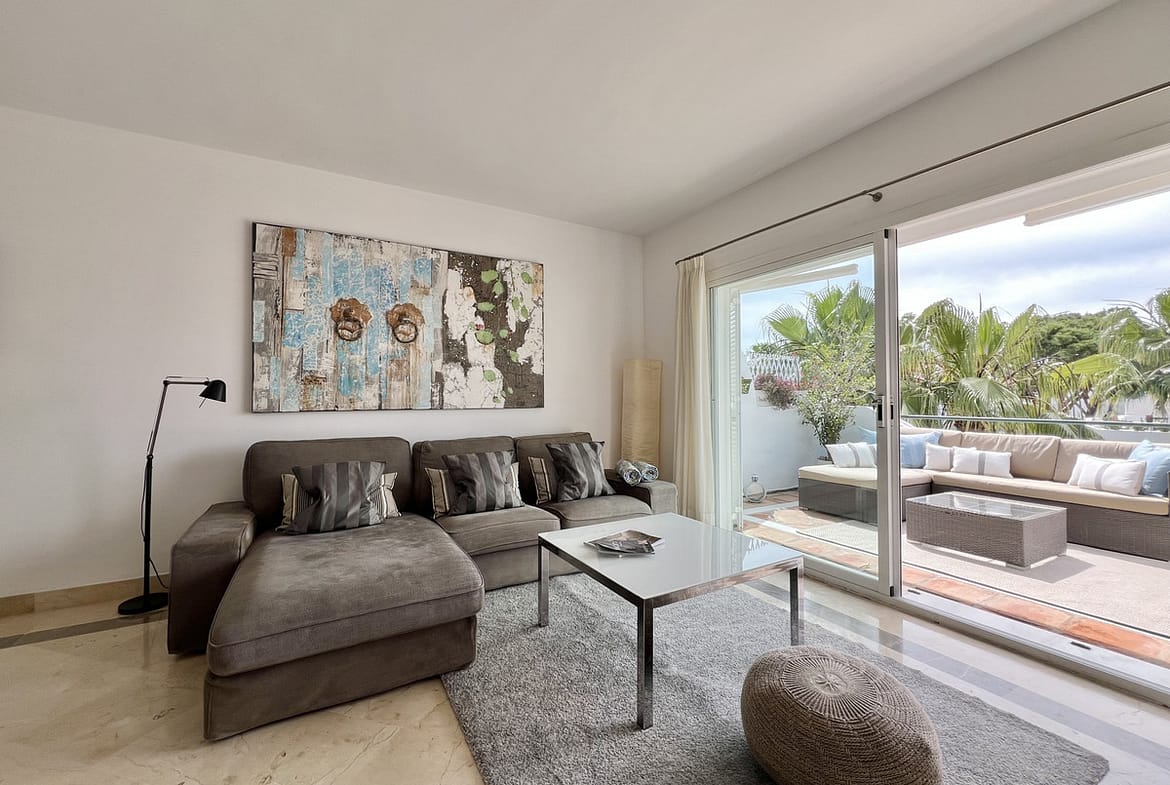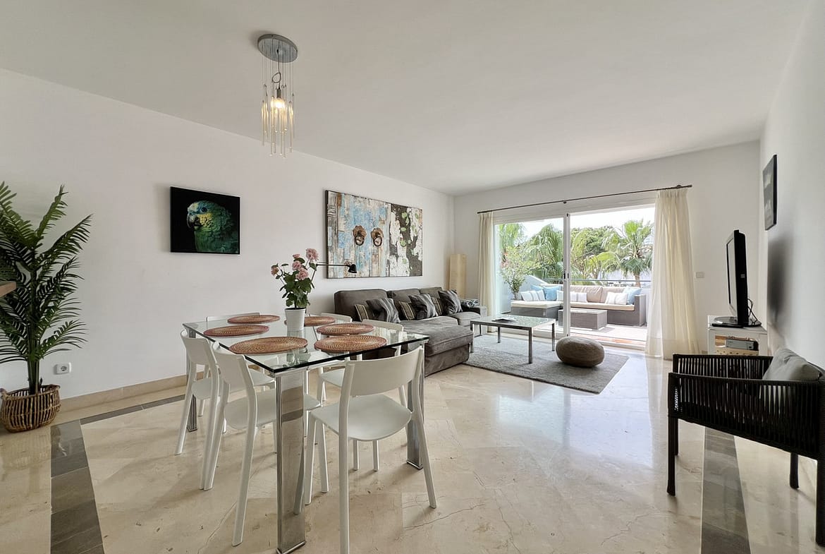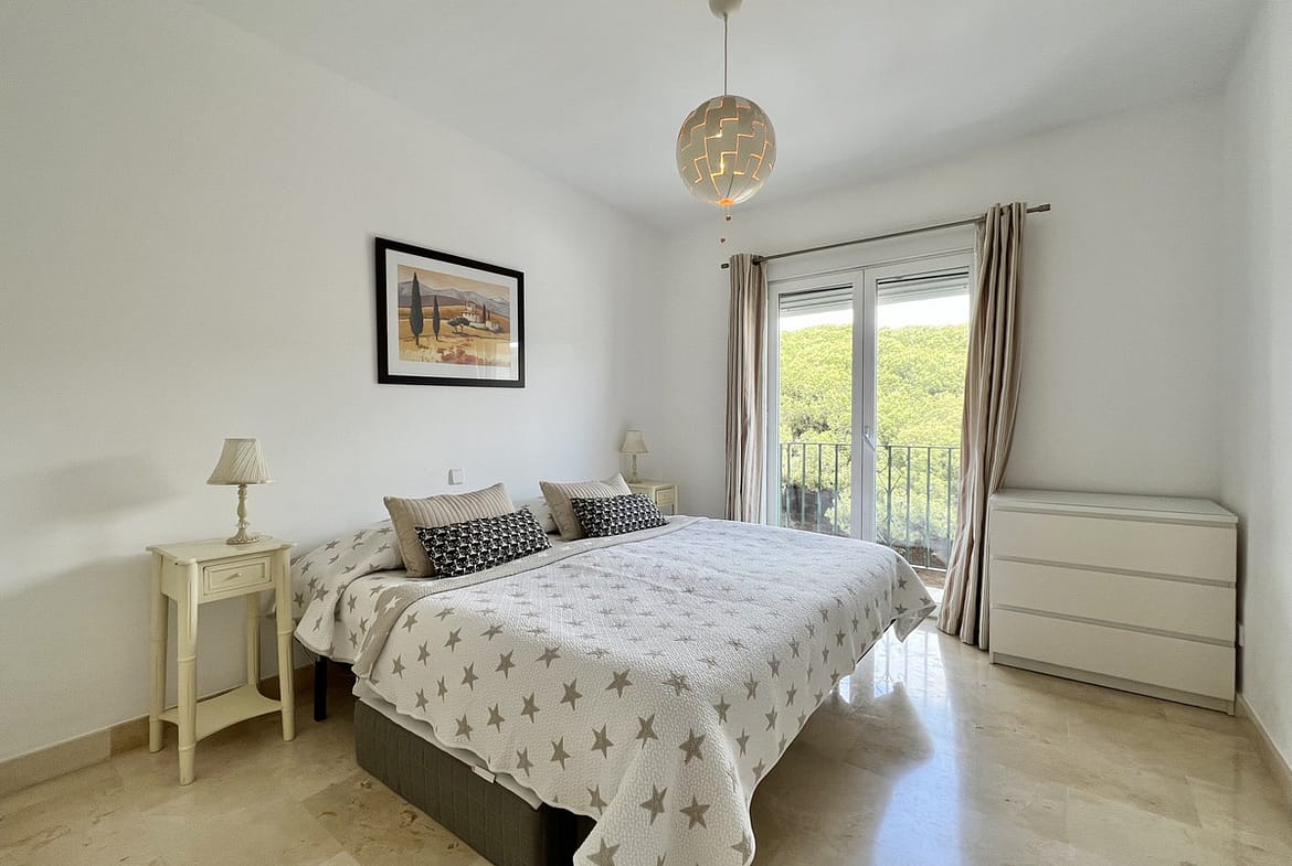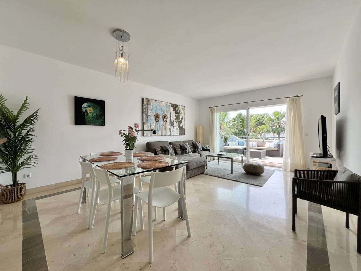 Fantastic top-floor apartment, south-facing, in El Presidente. The beautiful entrance, filled with aromatic plants, welcomes us, and as soon as we enter the hall, we appreciate how the entire apartment is bathed in sunlight. The spacious living and dining room, with large sliding glass doors, opens onto the very sunny terrace. The master bedroom also has direct access to the same terrace and features an en-suite bathroom. The second bedroom overlooks a charming pine forest. The second bathroom also serves as a guest toilet. The kitchen is fully equipped. El Presidente offers a large parking area, five swimming pools, one of them heated all year around, wonderful mature communal gardens with fountains, tennis and paddle courts, and 24-hour security. Amenities, supermarkets, and restaurants are within walking distance, as well as the beach, the new Estepona coastal path, and excellent restaurants such as Salduna, just 250 meters from the development. Do not miss the opportunity to visit this great opportunity!
