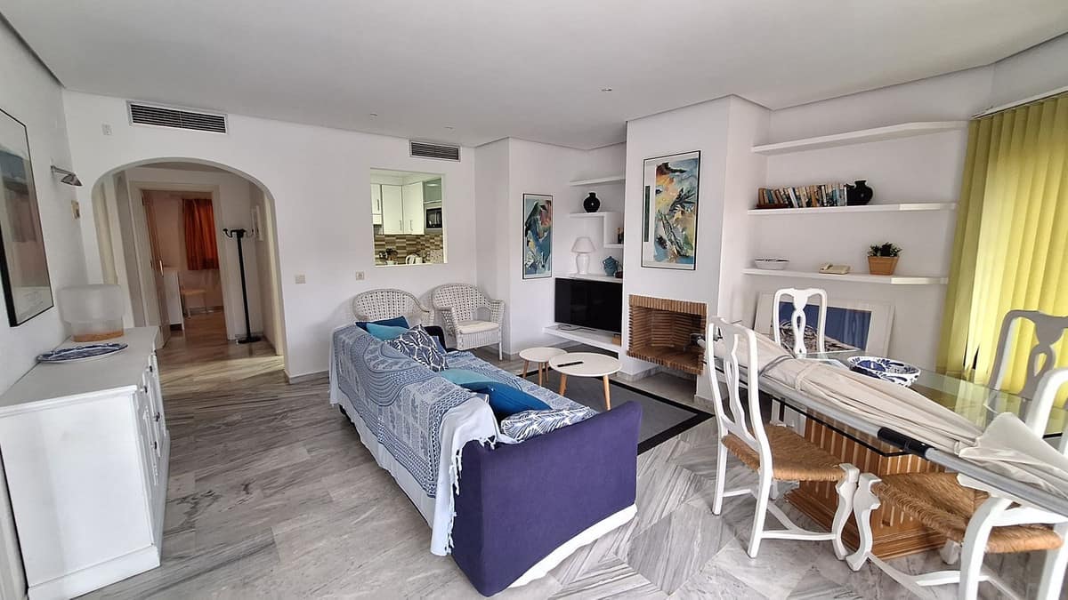 Charming 2 beds apartment, located on the first floor without elevator, just a five-minute walk to the beach in Elviria, located in the Urb. Golden Beach. At the entrance of the apartment we find a hall, and a small kitchen, two bedrooms and two bathrooms, one of them en-suite. A bright living room connects to the sunny terrace with beautiful open views towards garden areas.