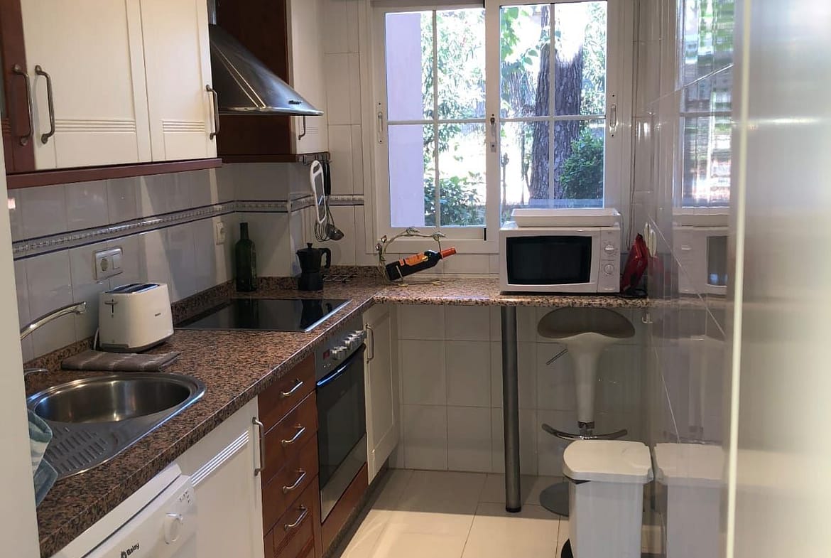 It has two bedrooms, one of which is en suite, a guest bathroom, a fitted and furnished kitchen, air conditioning and, best of all, a beautiful terrace with a private garden and direct access to a large communal swimming pool surrounded by beautiful gardens. Private parking space included. What also makes this property more attractive is its location within walking distance of shops, restaurants, as well as one of the best beaches on the east coast of Marbella, known for Nikki Beach and other famous beach restaurants. A safe investment with high tourist rental potential as it has a tourist licence or as a second home.