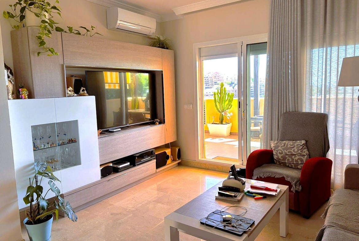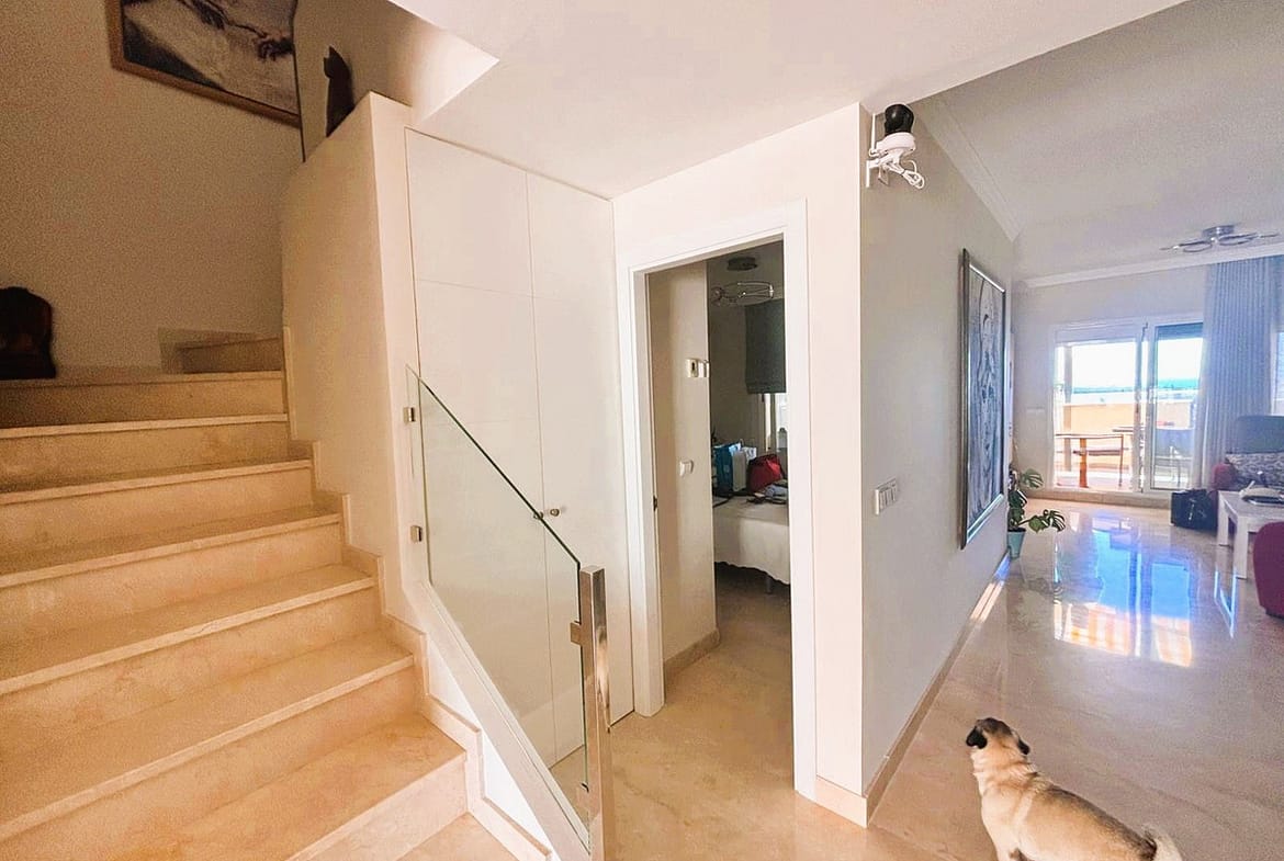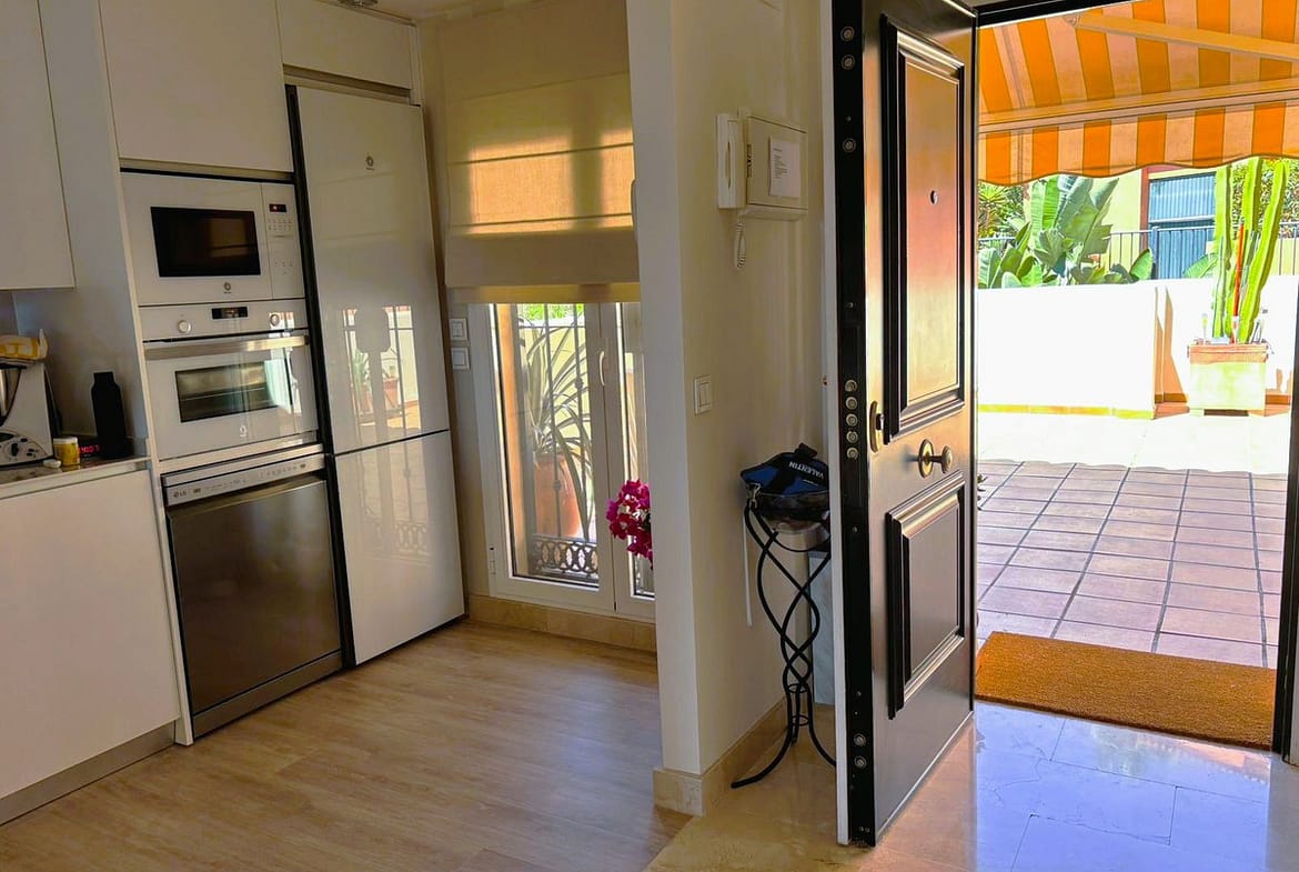 Beautiful property for sale in perfect condition in the Elviria area, close to the golf course and less than a 5-minute drive to the beach! Quiet, very residential urbanisation, ideal for permanent residence. Duplex , is on the ground level but with hight , no lift or stairs, very comfortable!!! The property is on a corner, so it is very sunny and bright and has sun all day long! Very large terrace at the entrance of the house, with awnings and afternoon sun. Upon entering, we find a spacious living room with an open, fully equipped kitchen, from the living room access to the second terrace, which faces south and offers open views of the sea, with sun all day long! There are also new awnings!