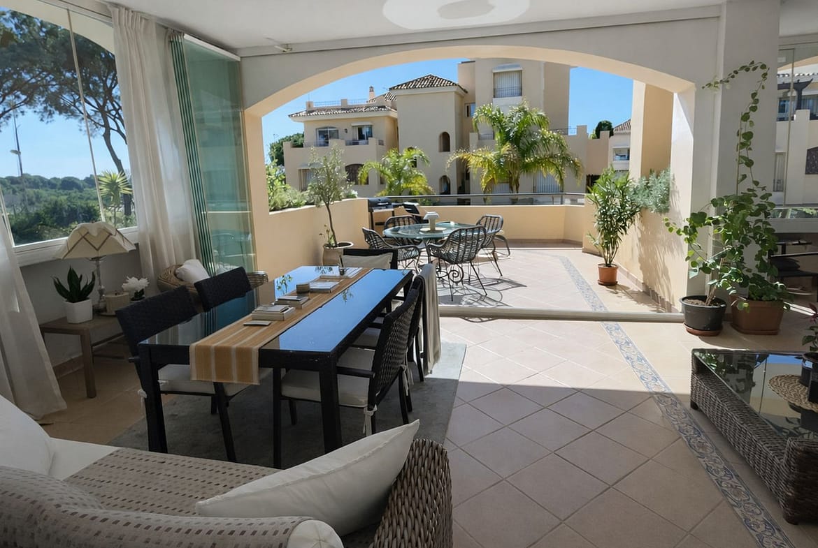 Beautiful apartment located in Hacienda Elviria, one of the most sought-after residential areas of Marbella, surrounded by nature and tranquility and just a few minutes from the best beaches of the Costa del Sol. The property offers 118.50 m² built, plus an independent laundry room of 4.34 m² and a spacious 61.41 m² terrace, perfect for enjoying Marbella’s sunny climate all year round. The apartment is distributed in an entrance hall, bright living-dining room with direct access to the terrace, independent kitchen, laundry room, two bedrooms, two bathrooms and a guest toilet, providing a comfortable and functional layout. Located on the ground floor of a well-maintained residential complex with communal garden areas, it offers privacy and a peaceful environment. The property is situated in Elviria (Las Chapas), a consolidated area with international schools, golf courses, supermarkets, restaurants and all services nearby, and only a short drive from the beach and Marbella town centre, making it ideal as a permanent residence, holiday home or investment opportunity on the Costa del Sol.