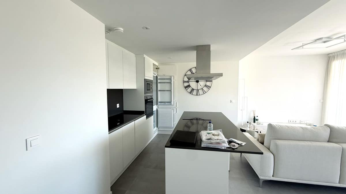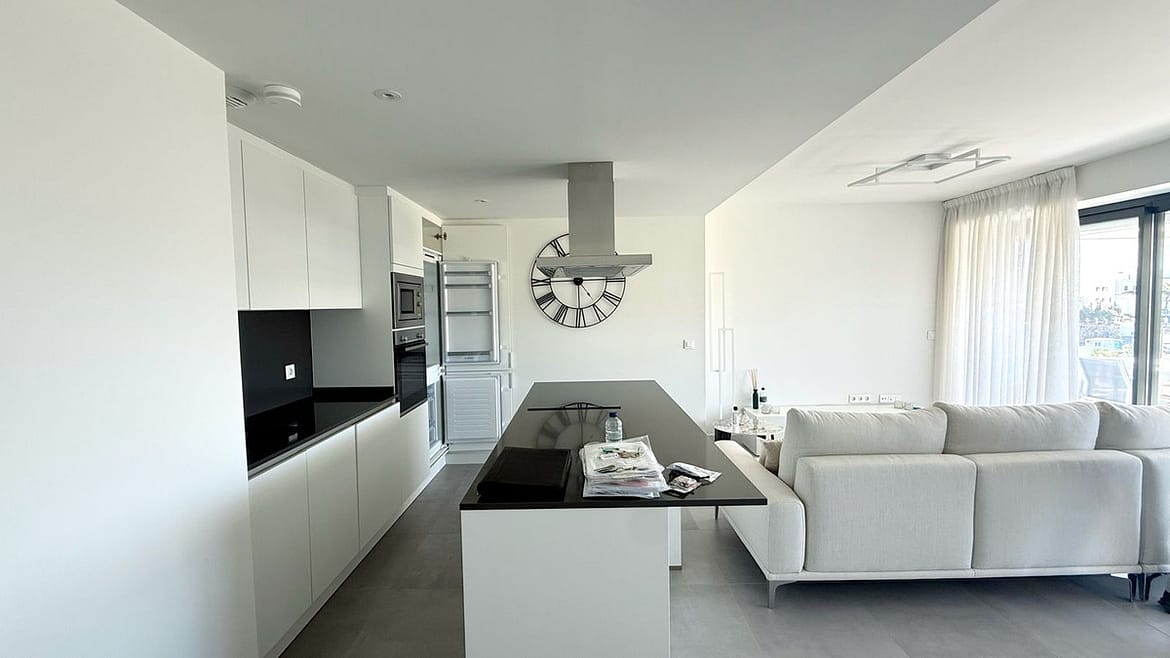 The bright living room blends seamlessly with a modern open-plan kitchen, creating a welcoming and stylish space for everyday living. Large glass doors open onto a private terrace with beautiful sea views, perfect for relaxing and enjoying the surroundings.