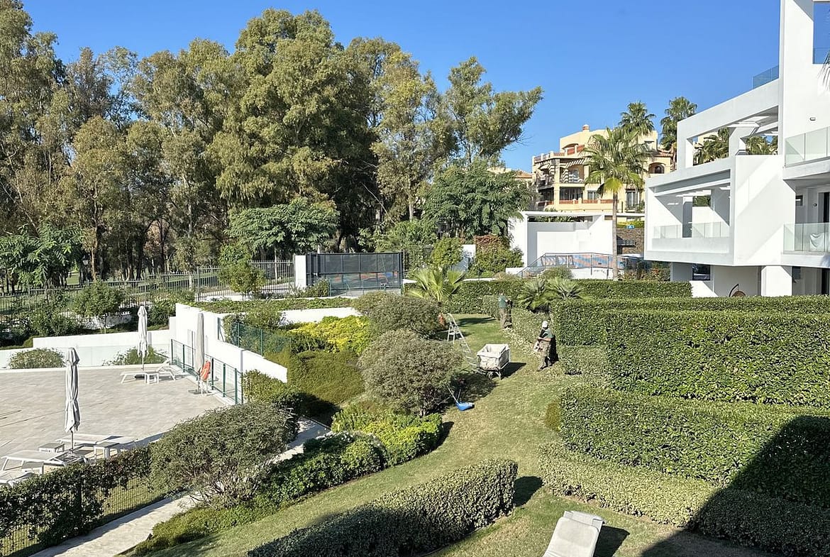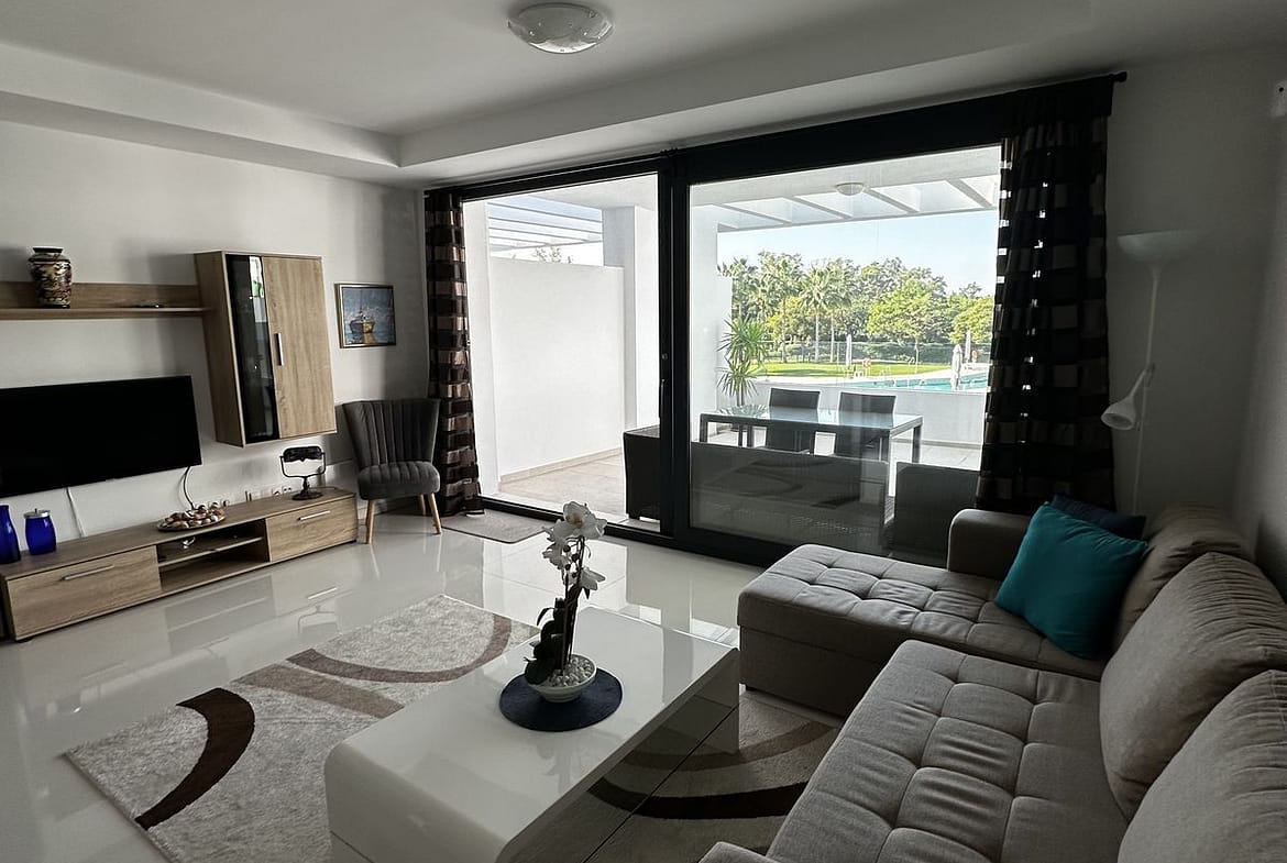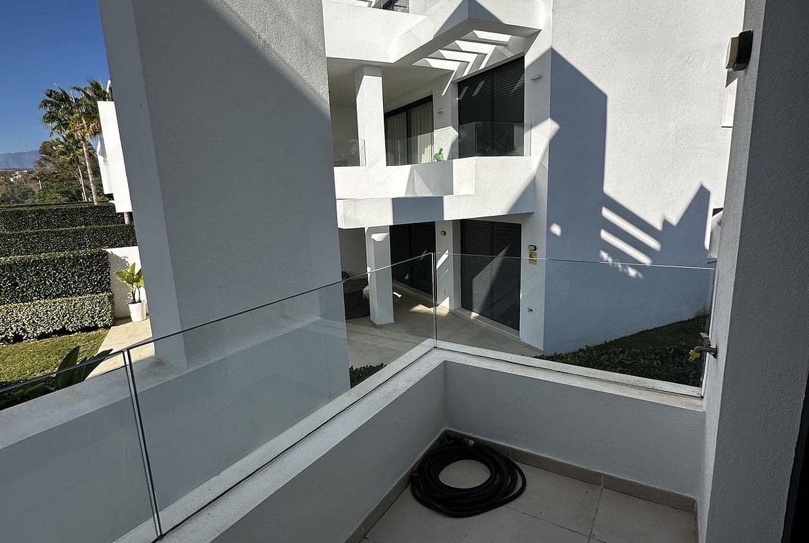 Modern and elegant two-bedroom, two-bathroom apartment located within a prestigious gated community on the front line of the Atalaya golf course. The property features a bright and spacious living room with an open-plan kitchen, marble floors, and direct access to a large private terrace (approx. 30 m²) offering beautiful views of the golf course and the surrounding gardens.