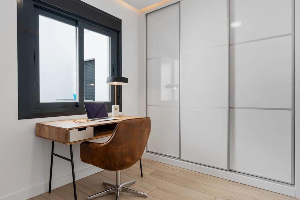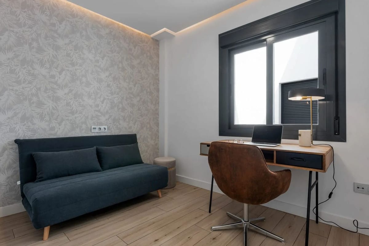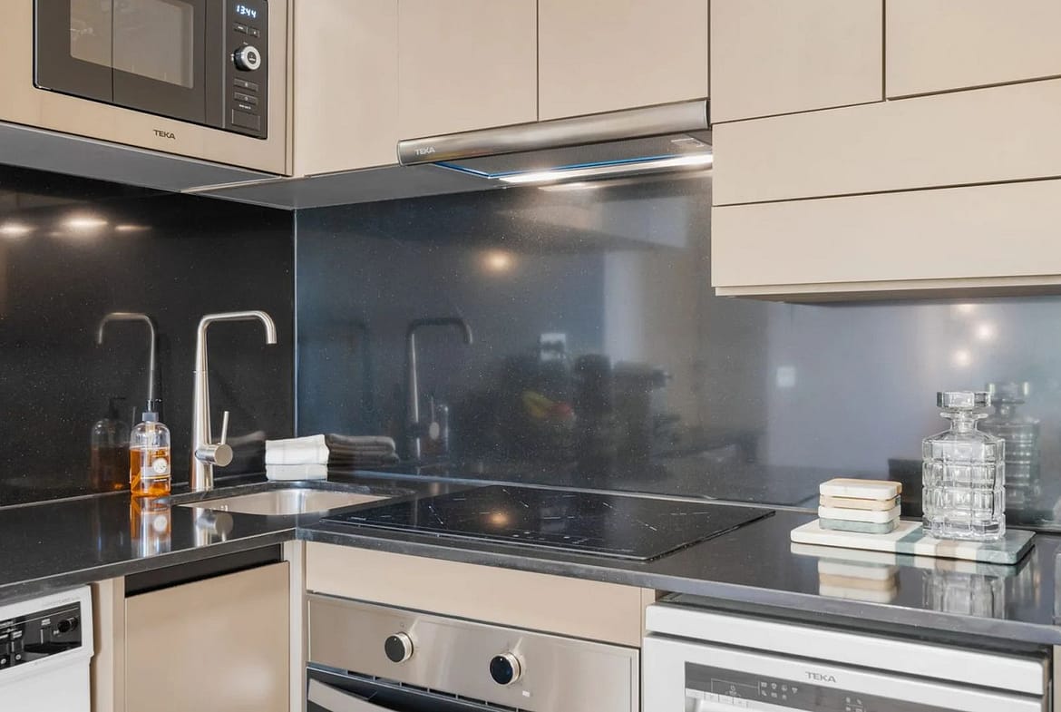 The property offers two bedrooms and two bathrooms. The spacious master bedroom includes large built-in wardrobes and an en-suite bathroom with walk-in shower, toilet and washbasin. The second bedroom is stylishly arranged as an office space with a sofa bed – ideal for guests or working from home. The second bathroom is also modernly finished and equipped with a walk-in shower, toilet and washbasin.