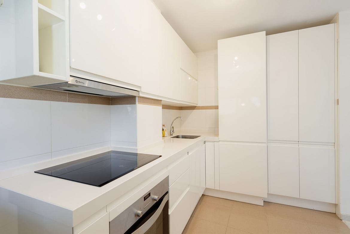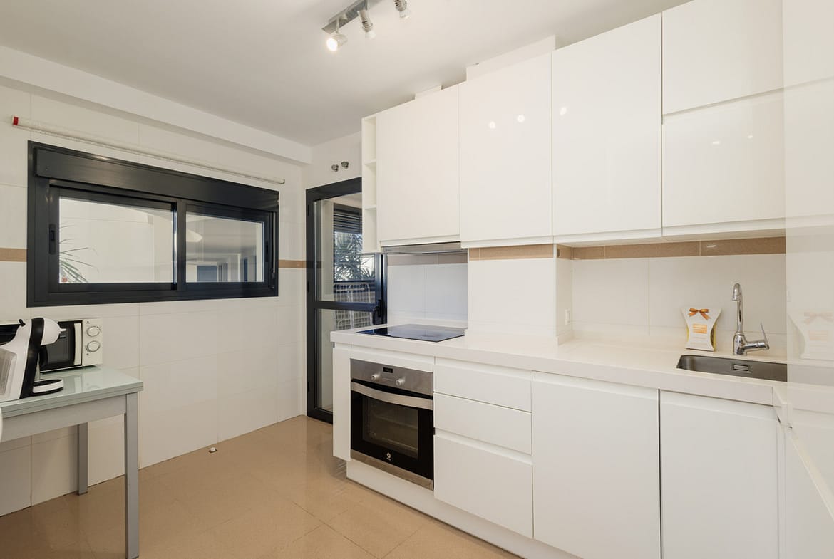 The two bedrooms, like the entire property, share a modern and minimalist style, enhanced by white tones that bring brightness. Both bedrooms have a balcony with panoramic views and built-in wardrobes. The master bedroom, with a double bed, also has a marble-finished en-suite bathroom with a vanity, bidet, and bathtub; the second bedroom has two single beds and easy access to the second bathroom, which features a spacious shower and vanity. Both rooms enjoy ample light thanks to their windows/balconies.