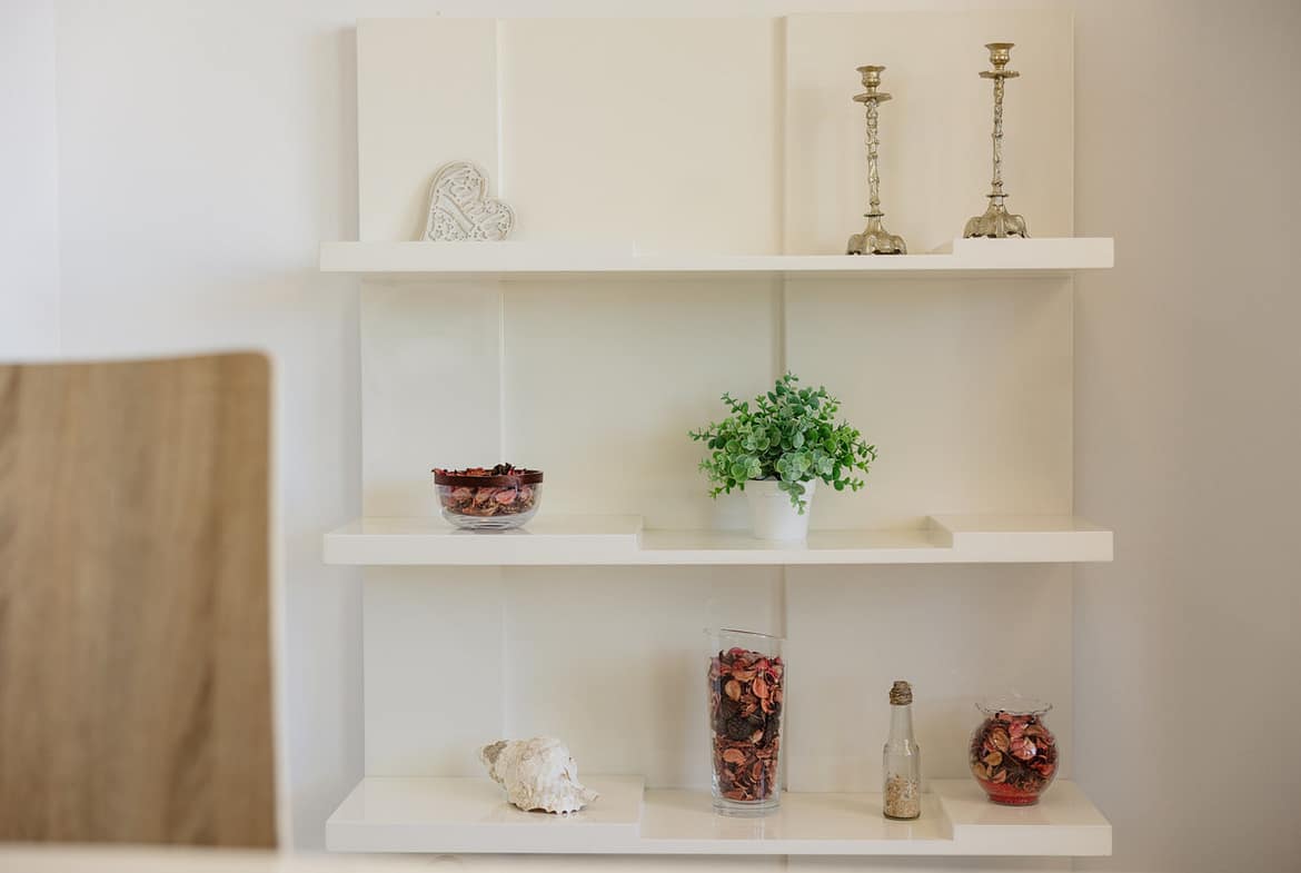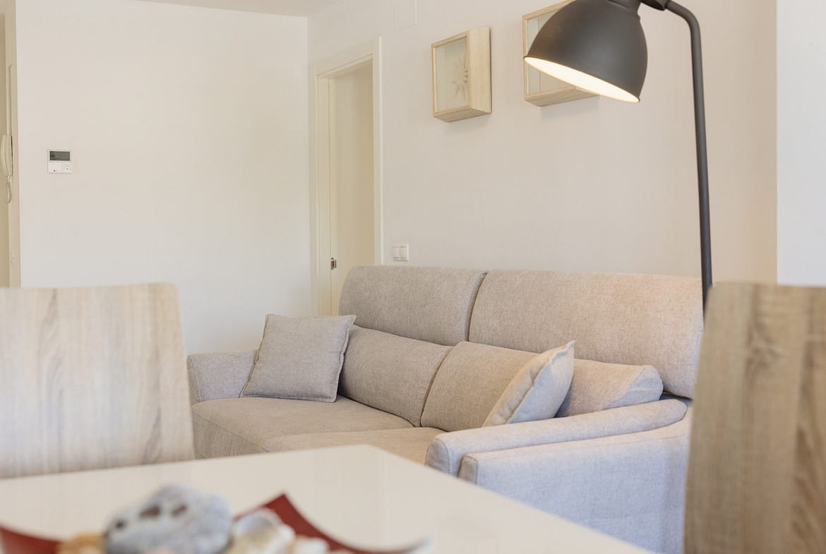Upon entering the apartment, you are greeted by a bright living-dining area leading to the private, glass-enclosed terrace with panoramic sea views and a dining space. The modern living area, furnished and inspired by mid-century modern style, invites relaxation with its comfortable L-shaped chaise longue sofa and smart TV. Next to it, the kitchen reflects the apartment’s clean, modern style and is fully equipped: fridge, oven, microwave, dishwasher, coffee maker, kettle, induction hob, etc.