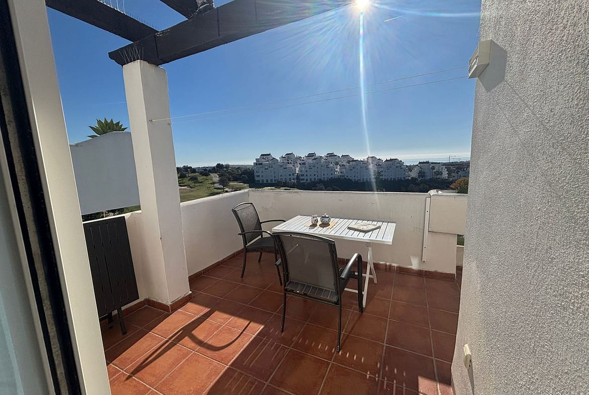 The property stands out for its south-facing orientation and abundant natural light. The spacious living area opens onto a main terrace, ideal for enjoying the Mediterranean climate all year round. From here, a staircase leads to a spectacular private solarium—one of the property’s key highlights—offering stunning panoramic views of the sea and the golf course, perfect as a chill-out area or for entertaining guests.