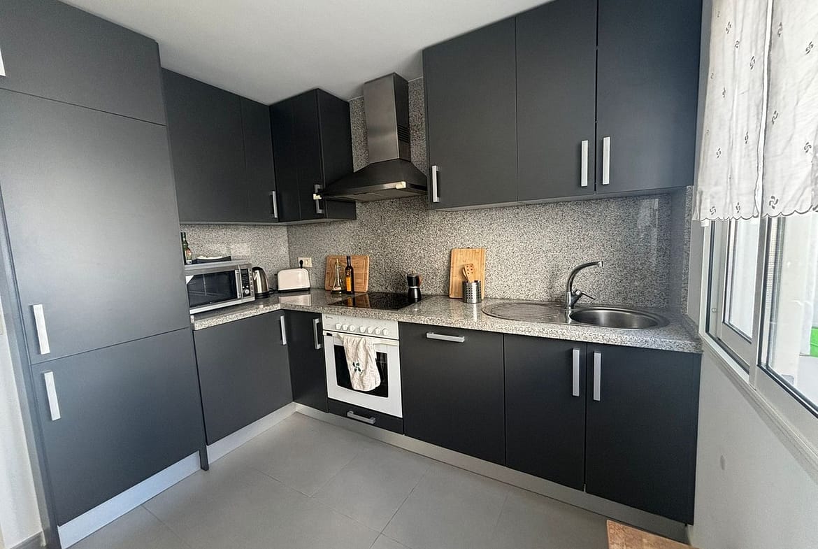 The kitchen is independent, modern, and fully equipped, with direct access to a balcony that adds practicality and ventilation.