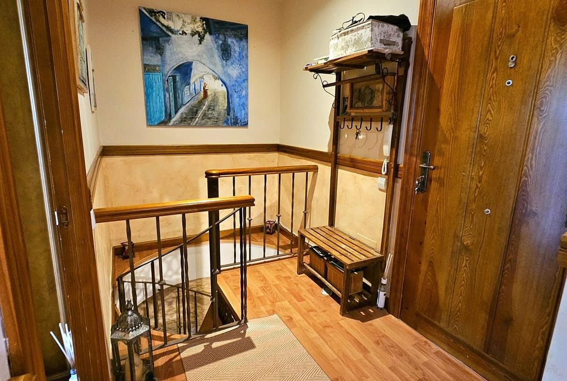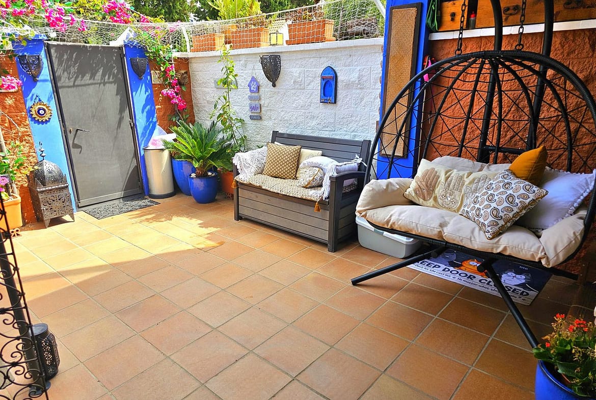 This duplex is inside a beachfront complex and one of the first houses near the beach with sea views from the upper terrace. At the entry you are in a big yard with barbacue, eating area and a lot of free uncoverd space for chill out area or anything you like.crossing the yard you enter a spacious living room with an open kitchen, all very rustical style and there is another doble bed in a separate area next to the living room towards the yard with a curtain for the division and there is one bathroom.