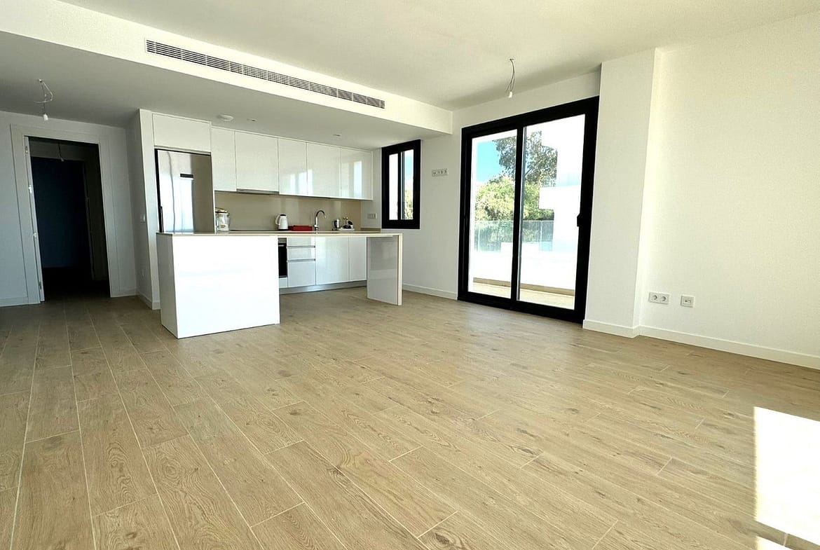 Constructed in 2024, the apartment features a brand-new, unused kitchen seamlessly integrated into an open-plan living area, which flows onto a private terrace and garden—perfect for enjoying the Mediterranean lifestyle.