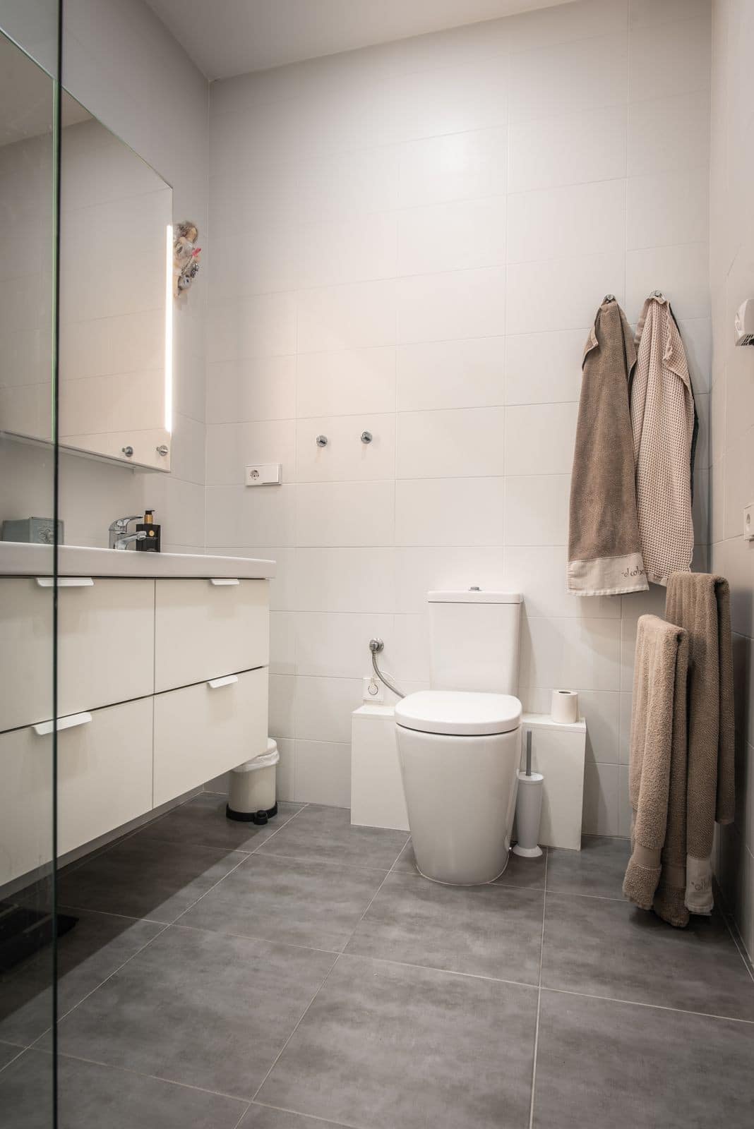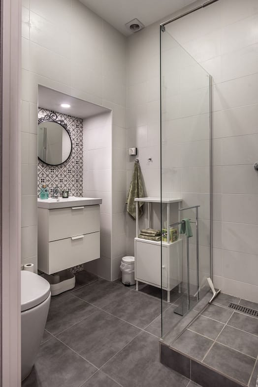 The apartment has two bedrooms and two bathrooms, one master bedroom with built in closets and a private bathroom with a large shower, and one extra bedroom connected to a bathroom with shower. Double beds can be accommodated in both bedrooms. New air conditioner has been installed in the apartment in 2020.