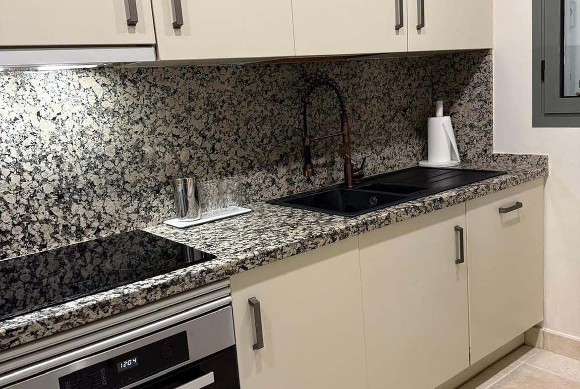 The apartment, with a built area of 140 m² (99 m² of interior space and 41 m² of a spacious private terrace), offers 2 bedrooms and 2 full bathrooms. The interior is characterized by its brightness and functional layout, featuring a spacious living room, fully equipped kitchen, built-in wardrobes, and high-quality finishes such as double-glazed windows and electric shutters.