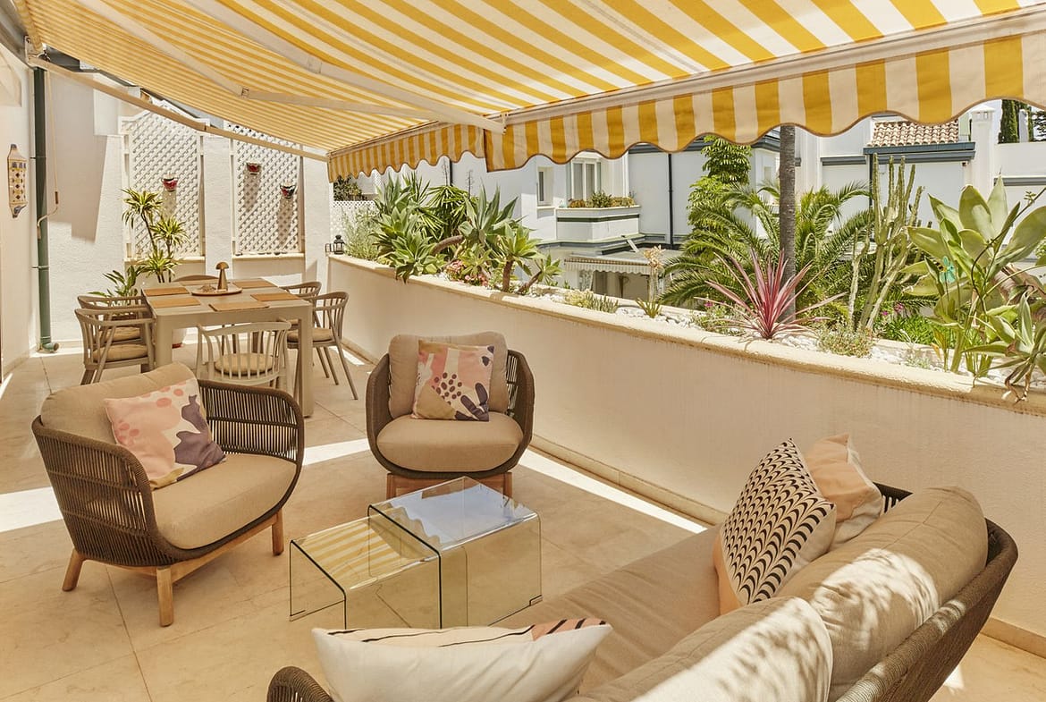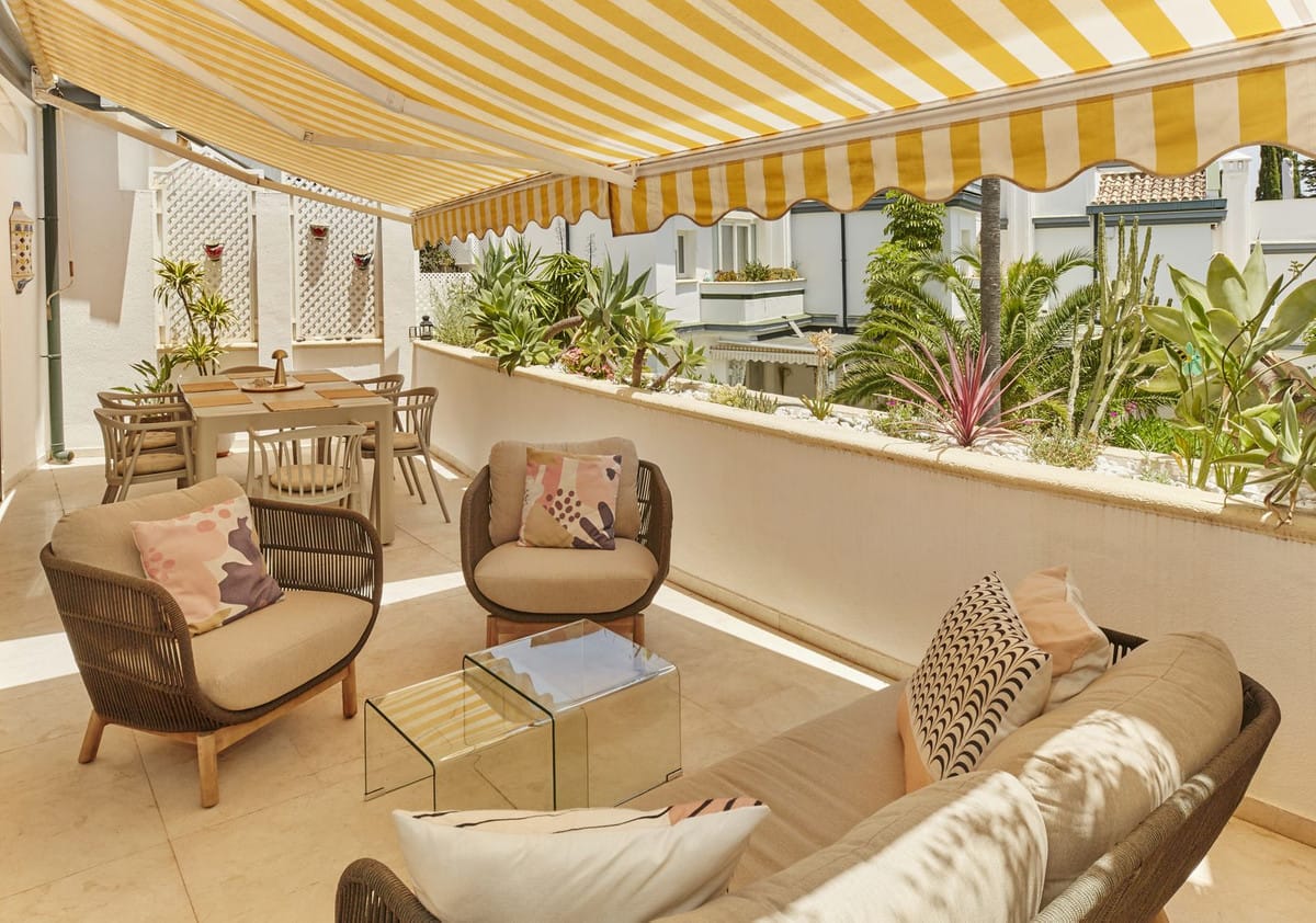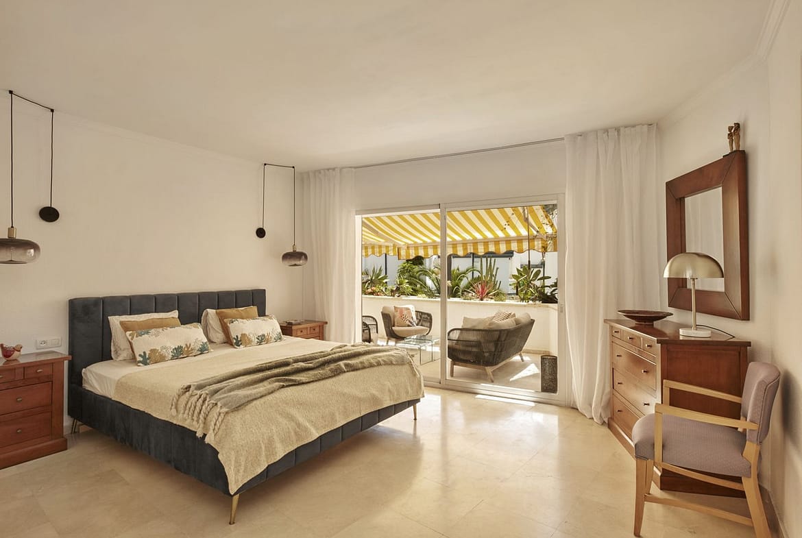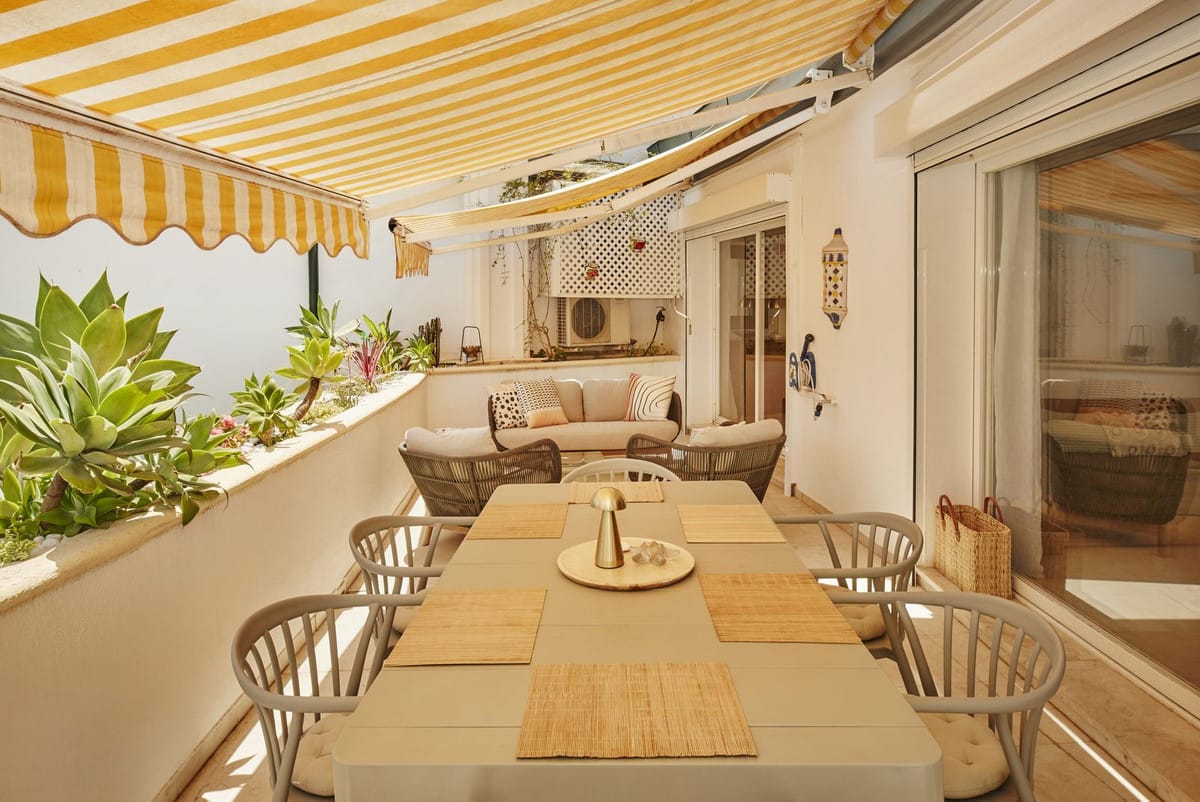 The apartment itself is a two-bedroom unit with a spacious living room and a terrace facing south, overlooking the lovely gardens where you can hear birds singing. The urbanization is stylish, Andalusian, and very well-maintained.