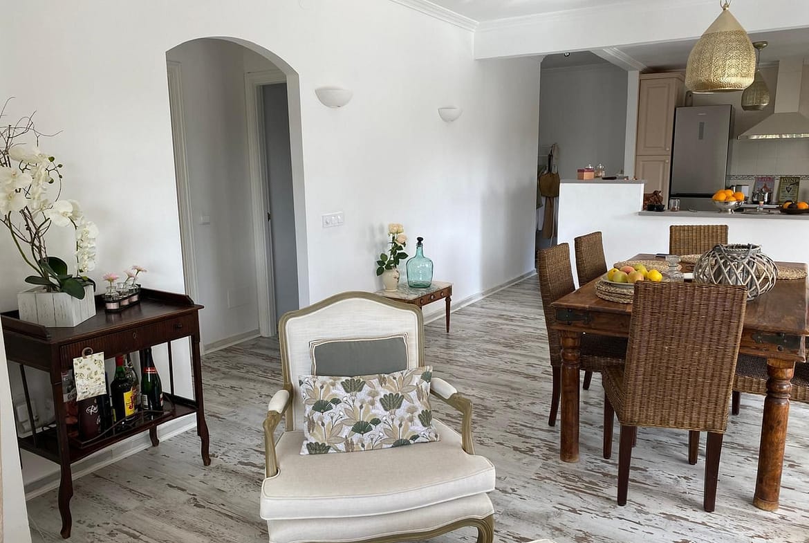 The bright and airy living room connects naturally with the outdoor spaces, creating a seamless flow between interior and exterior. The interior design is modern, timeless and refined, with carefully selected finishes that convey quality and elegance.