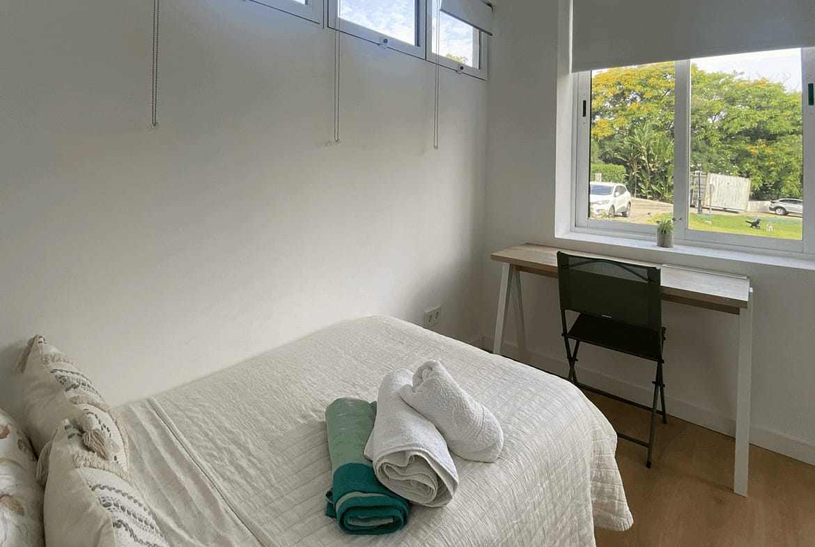 With a total surface of 60 m², it includes 2 bedrooms, 1 bathroom, a fully equipped kitchen, and a bright living room opening onto a terrace overlooking the community gardens.