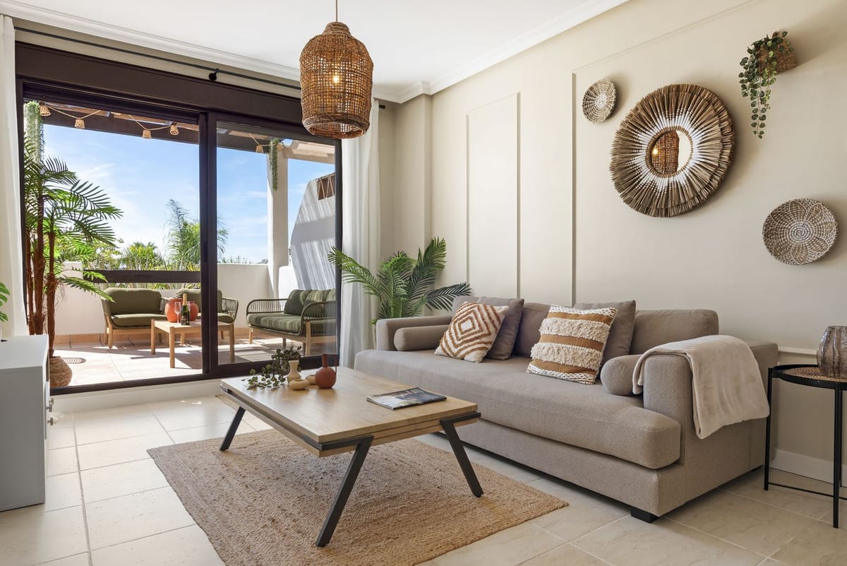 The spacious and bright living room connects directly to the sunny terrace, where you can enjoy impressive views of the surroundings and even Gibraltar. Together with the fully equipped kitchen, it creates a welcoming living space perfectly suited for long-term stays. The kitchen is fitted with all necessary appliances, ensuring you have everything you need throughout your stay.