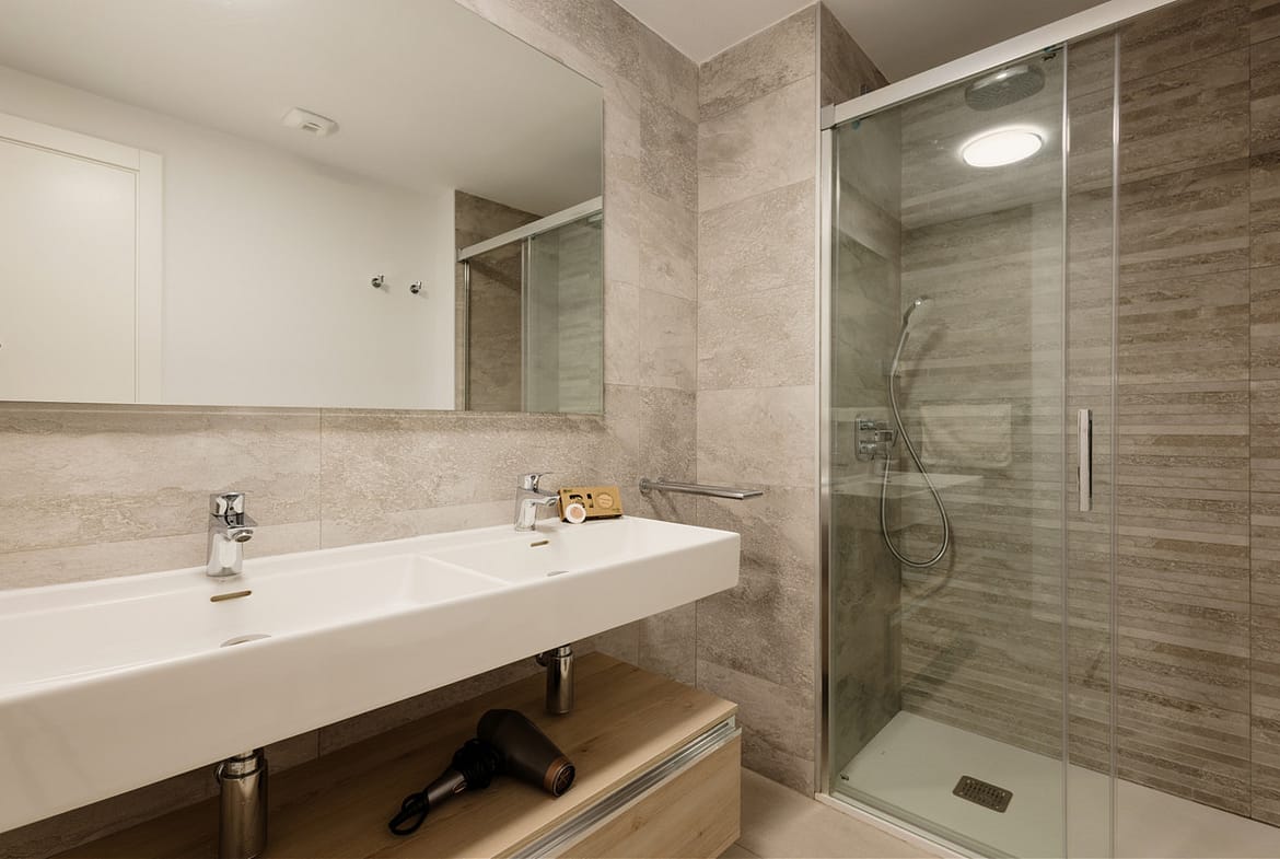 The master bedroom is en suite, has a dressing room and direct access to the garden, and is equipped with a double bed. The bathroom has a walk-in shower, toilet and double sinks.