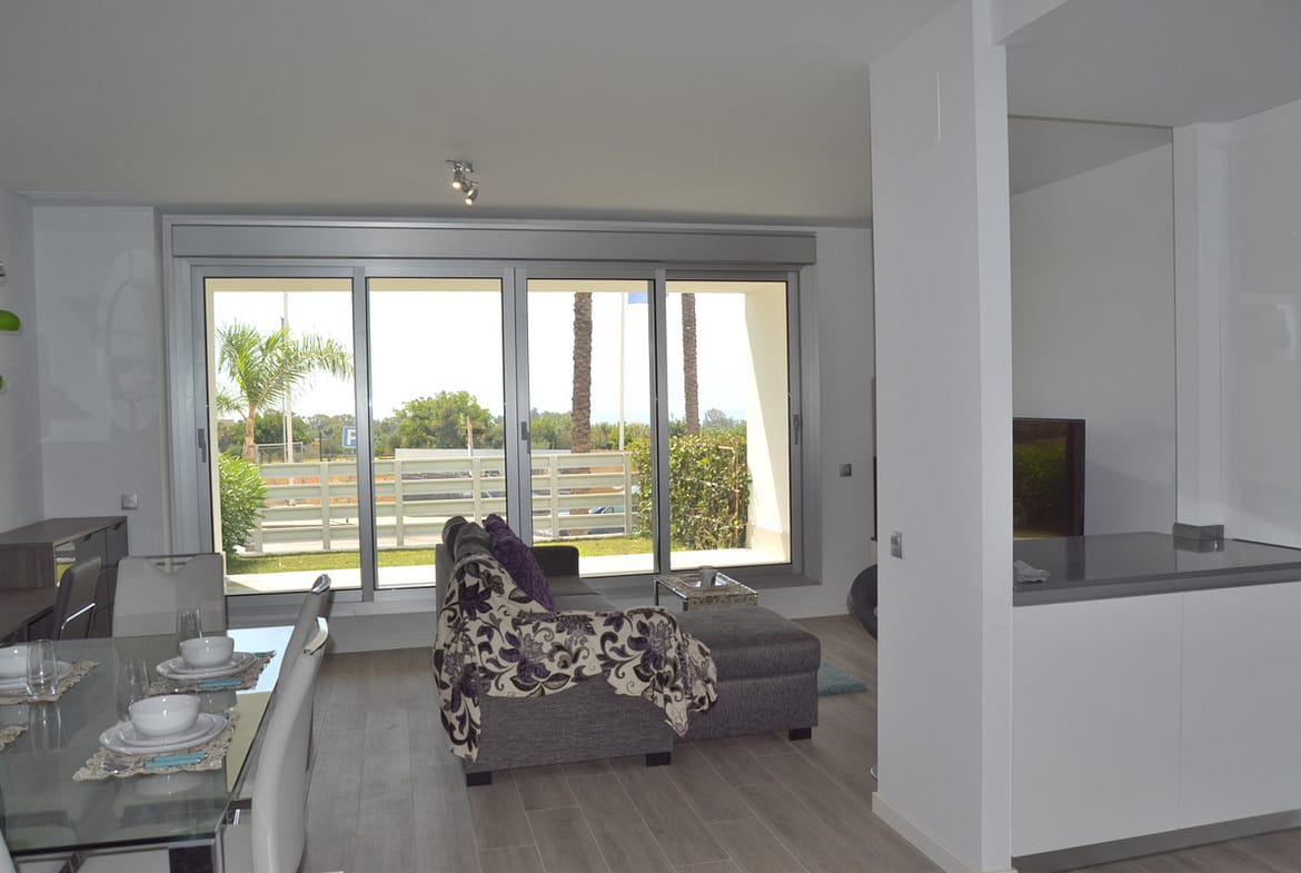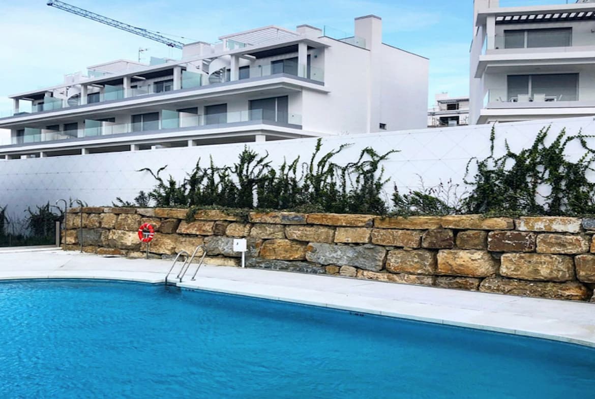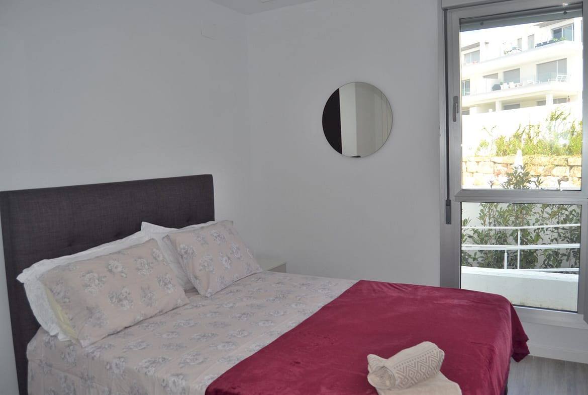 Modern apartment located in the charming village of Cancelada in Estepona. The garden apartment consists of a bright lounge and dining area have access to a private wouth facing terrace of 18 sqm and a garden of 30 sqm. The open plan kitchen is fully equipped with top range appliances. The 2 bedrooms have en-suite bathrooms and fitted wardrobes. The complex is gated with security services and concierge and has 2 swimming pools, kids pool and play area. Few minutes walking to shops, restaurants and services and only 5 minutes by car to the beach and Los Flamingos golf course.