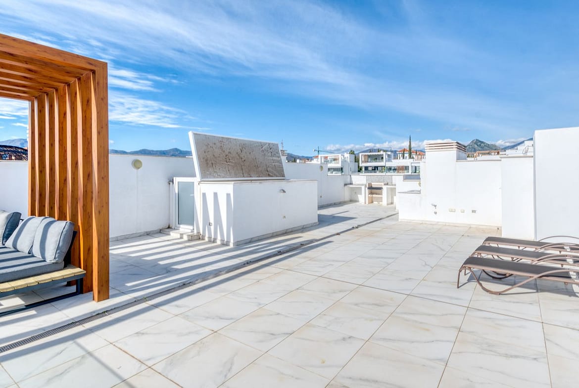 Beautifully maintained and set in an exclusive gated community along Estepona's sought-after New Golden Mile, this penthouse apartment is just 500m from local amenities and a short walk to the beach. Positioned in one of the best spots within the community, the property enjoys fantastic views across the manicured tropical gardens, swimming pool, mountains, and the sea beyond. It’s a calm, elegant space designed for effortless coastal living. Inside, the apartment offers a bright open-plan layout with a sleek American-style kitchen, premium appliances, and underfloor heating in the bathrooms. The spacious living area flows onto a large private terrace perfect for dining outdoors or soaking up the Mediterranean sun. Both bedrooms are generous and filled with natural light, and the master suite opens directly onto the terrace, featuring an en-suite bathroom, while the second bedroom is ideal for guests or family, with a full second bathroom adjacent. A solarium of over 100m2 offers panoramic views ideal for outdoor dining and entertaining.