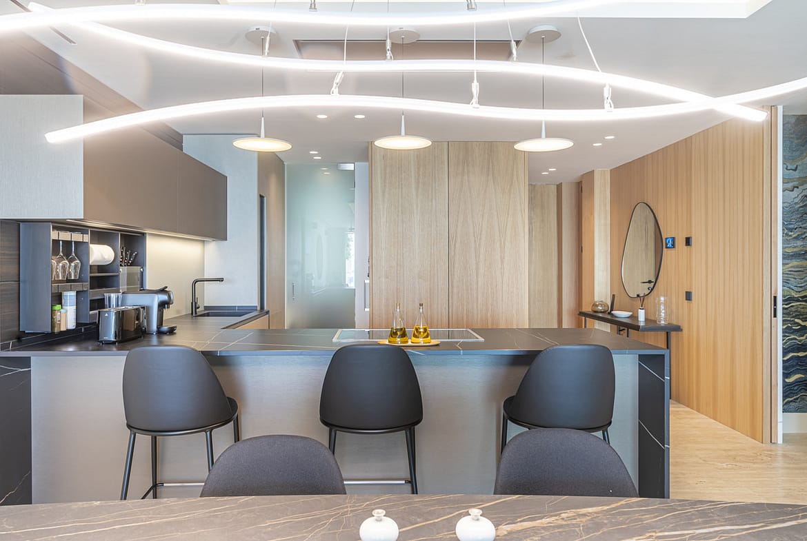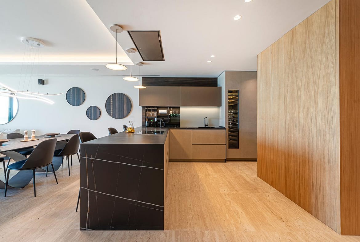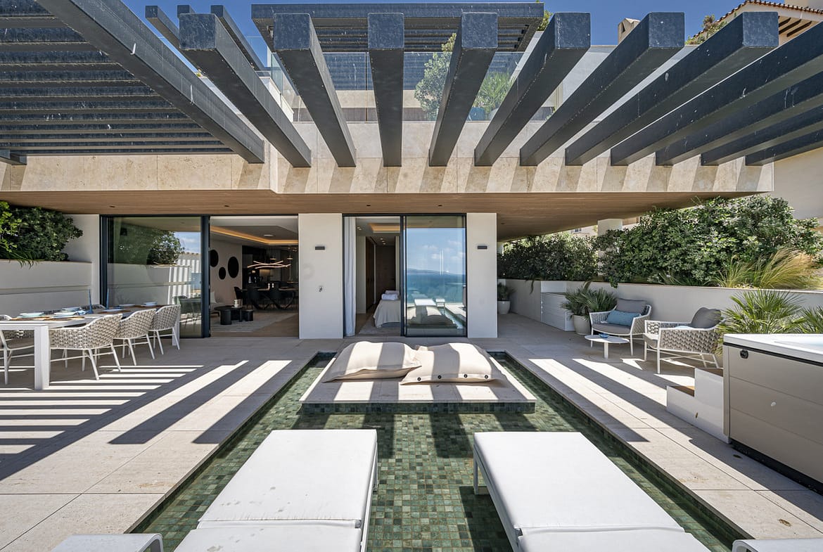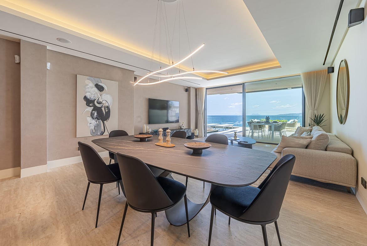 Spanning an impressive 120m² of interior space, the apartment features two generously proportioned bedrooms and two meticulously designed bathrooms. The fully fitted kitchen, equipped with high-end appliances, flows seamlessly into the open-plan dining and living areas, creating a perfect space for entertaining or relaxation. Premium finishes, including marble flooring, double glazing, and glass doors, enhance the sophisticated aesthetic, while the home automation system, central heating, and air conditioning ensure year-round comfort. Additional highlights include a utility room, storage room, and a private garage.