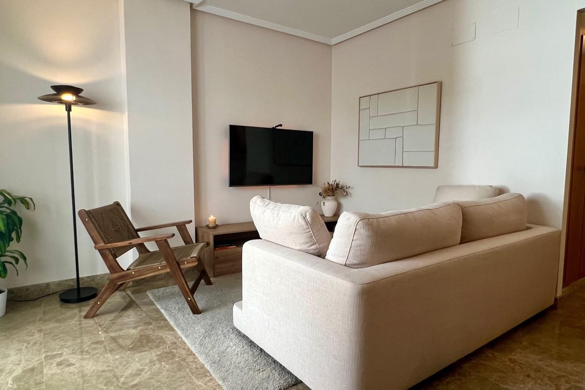 The apartment offers 136 m² of built space and features two spacious bedrooms with fitted wardrobes, two complete bathrooms (one en suite), a bright living room with direct access to a covered terrace and a private garden, perfect for relaxing, sunbathing, or family living. The large kitchen is fully equipped with all appliances and generous storage space, complemented by an independent laundry room that also functions as a small storage area for personal belongings or beach equipment.