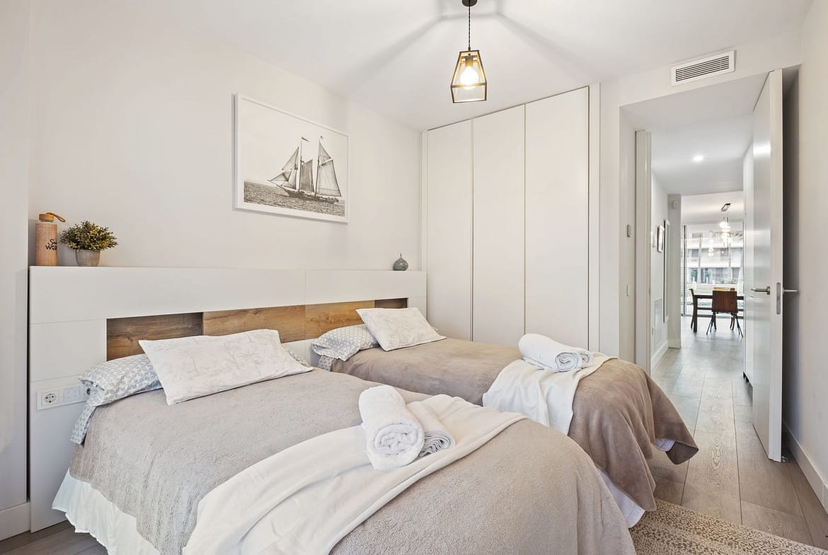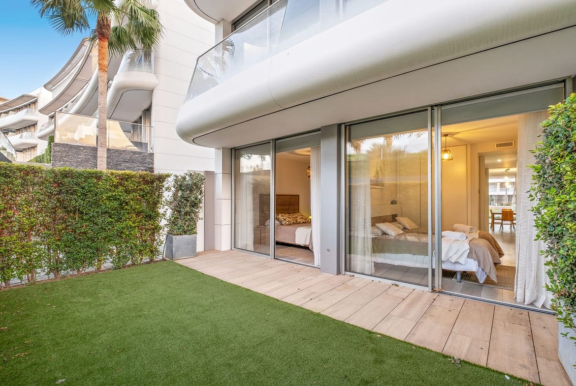 The master bedroom features its own bathroom, built-in wardrobe, and direct access to a private outdoor garden. The second bedroom also includes a built-in wardrobe and opens onto a private garden area, making both rooms feel airy and connected to nature. All the furniture throughout the apartment is of premium quality, enhancing the refined and modern atmosphere.