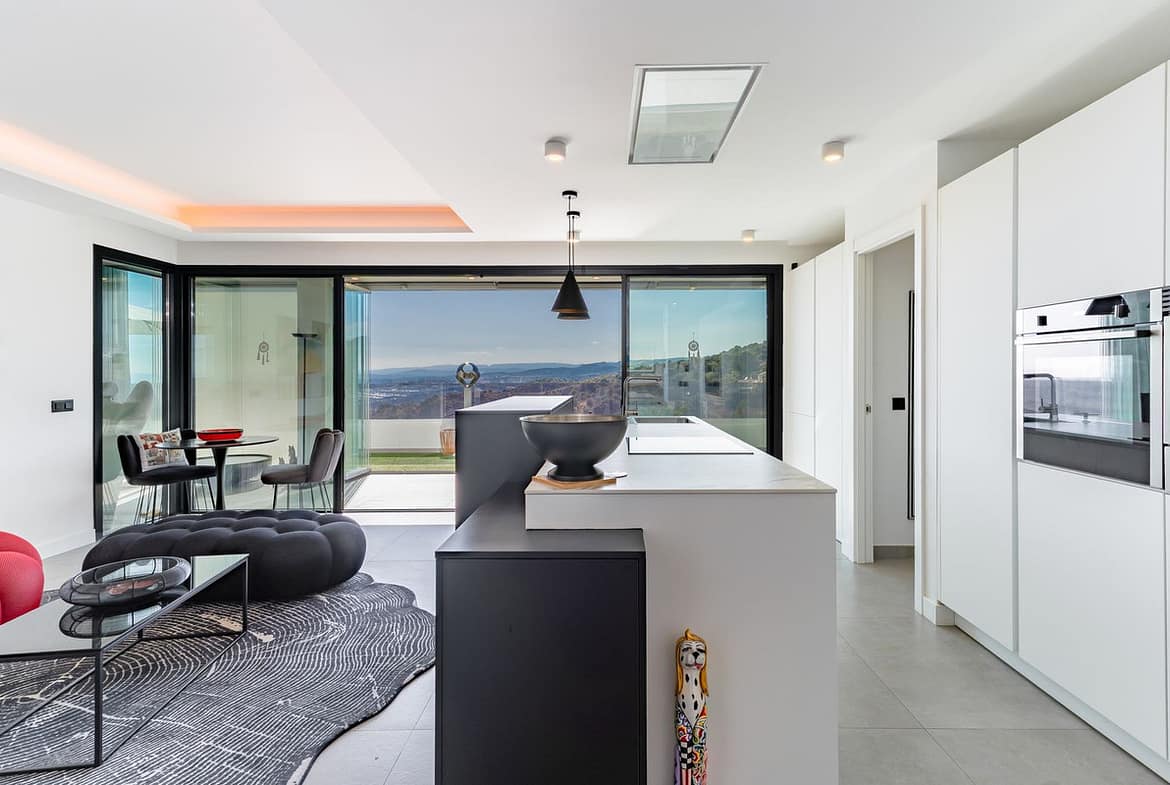 The space comprises 108,46 m² of built area plus a 307,60 m² terrace – ca. 400 m² in total. Part of the terrace has been enclosed with Lumon glass curtains and full air conditioning, expanding the usable interior to approximately 200 m² of living space usable year-round, alongside 200 m² of open terrace for pure Mediterranean outdoor living. The interior has been thoughtfully reconfigured into two expansive bedroom suites, prioritising comfort and flow.