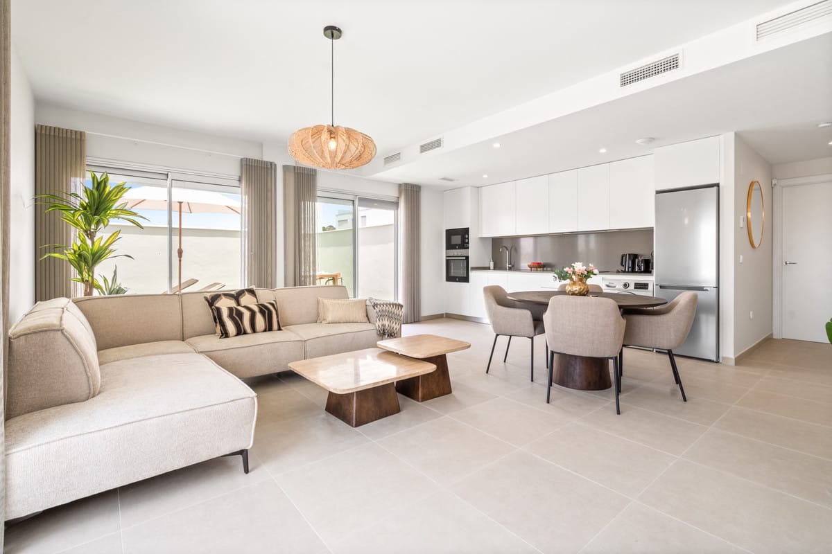 The interior is spacious and light-filled, with a modern open-plan living and dining area that connects effortlessly with the outdoor space. The fully furnished property is delivered turnkey, ready to move in and enjoy immediately. The kitchen is fully equipped with high-end appliances, and both bedrooms feature built-in wardrobes and elegant bathrooms.