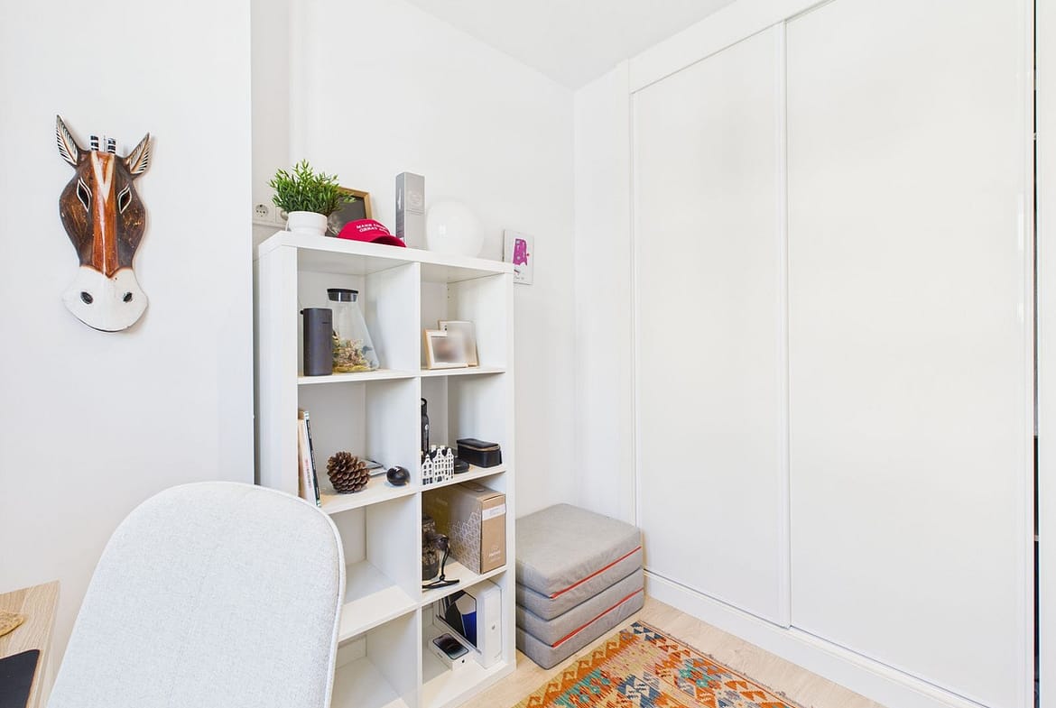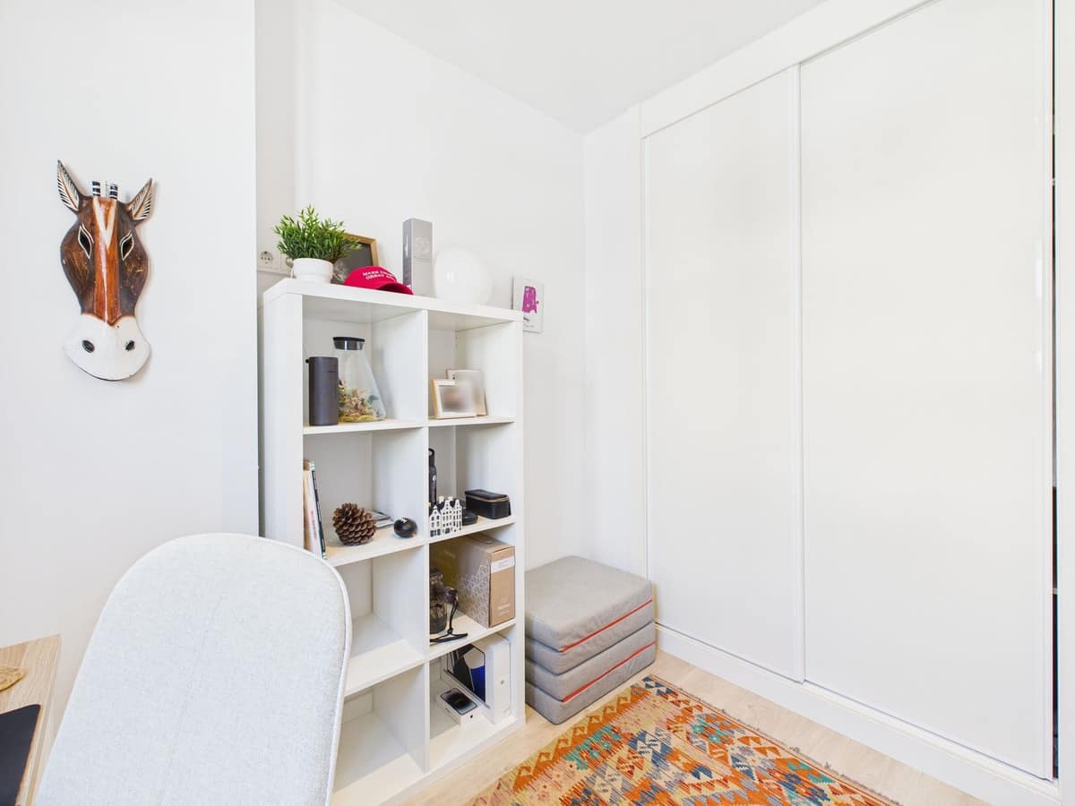 Inside, the apartment boasts a generously sized living area, complemented by a separate, fully equipped modern kitchen.