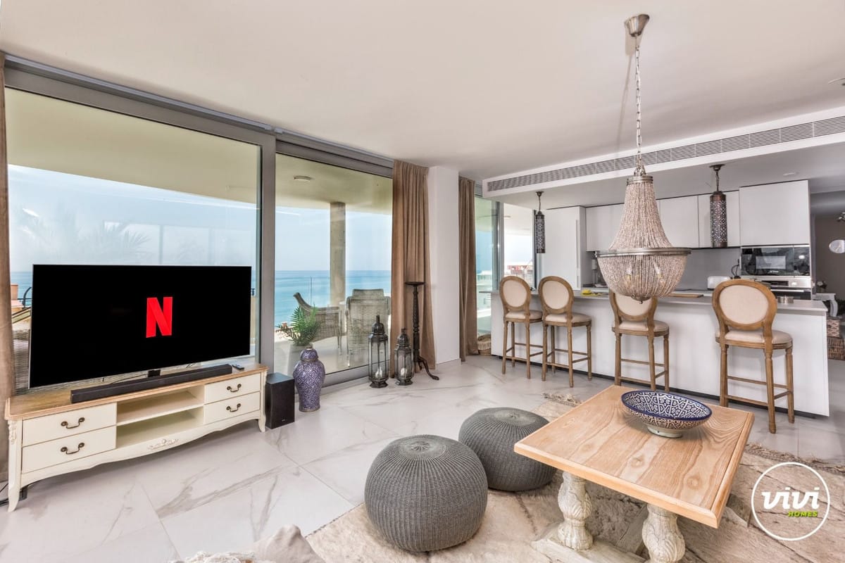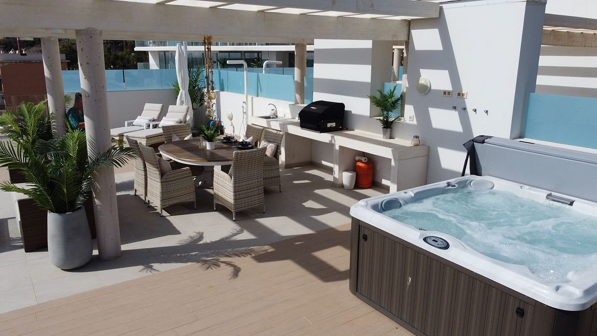 Completed in 2021, the apartment is distinguished by the largest terrace in the complex. The private rooftop solarium includes a built-in BBQ, Jacuzzi and outdoor shower, creating a serene retreat for sun-filled days and evenings with friends.