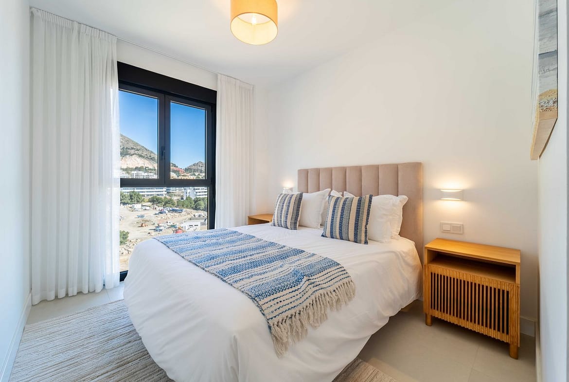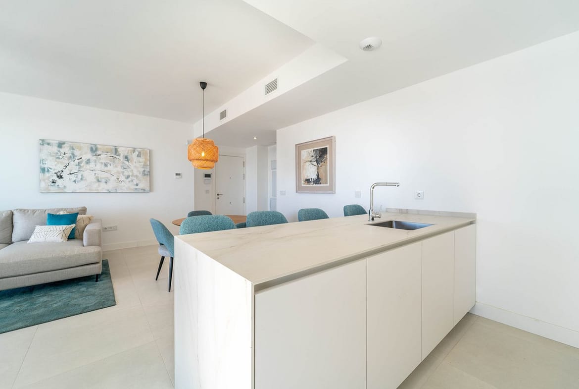 This recently completed property offers 120 m² of interior space plus a spacious south-facing terrace, designed to maximise natural light and open Mediterranean views. The layout combines a bright living-dining area with a contemporary open kitchen and breakfast bar, creating a functional and elegant living space.