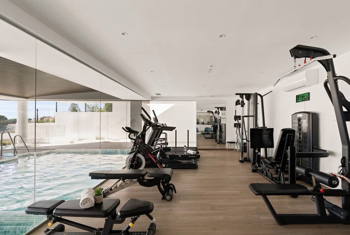 Residents enjoy premium communal amenities including a heated indoor swimming pool, gym, and sauna, all within a secure gated complex with lift access and private parking.