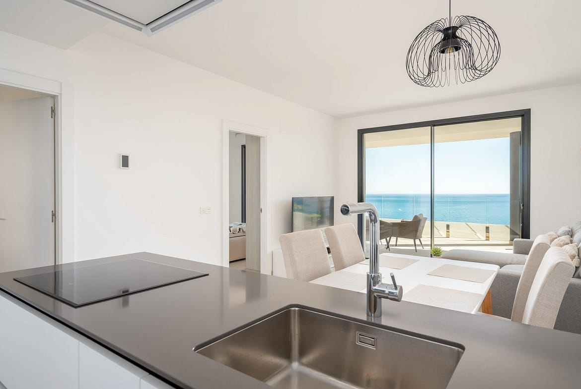 The apartment features a bright open-plan living and dining area with direct access to a spacious terrace showcasing panoramic views of the Mediterranean. The contemporary kitchen is fully equipped, and both bedrooms are generously sized, with the master suite offering an en-suite bathroom and built-in wardrobes. The finishes are of high quality throughout, making this a move-in-ready home.