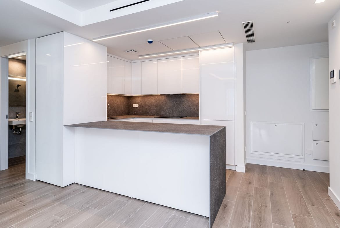 The open-plan layout seamlessly connects the kitchen, living, and dining areas, creating a light-filled, welcoming space. Premium materials such as stone, steel, wood, ceramics, and glass give the apartment a refined and modern feel, while large windows enhance natural light and the connection to the outside.