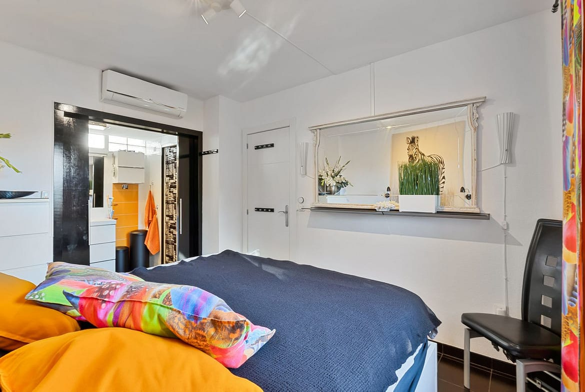 To the left of the hall is a spacious laundry room with extra storage, the smaller bedroom with space for 2 beds and a bathroom with shower. The master bedroom is located at the other end of the apartment and has an en-suite bathroom and wardrobe.