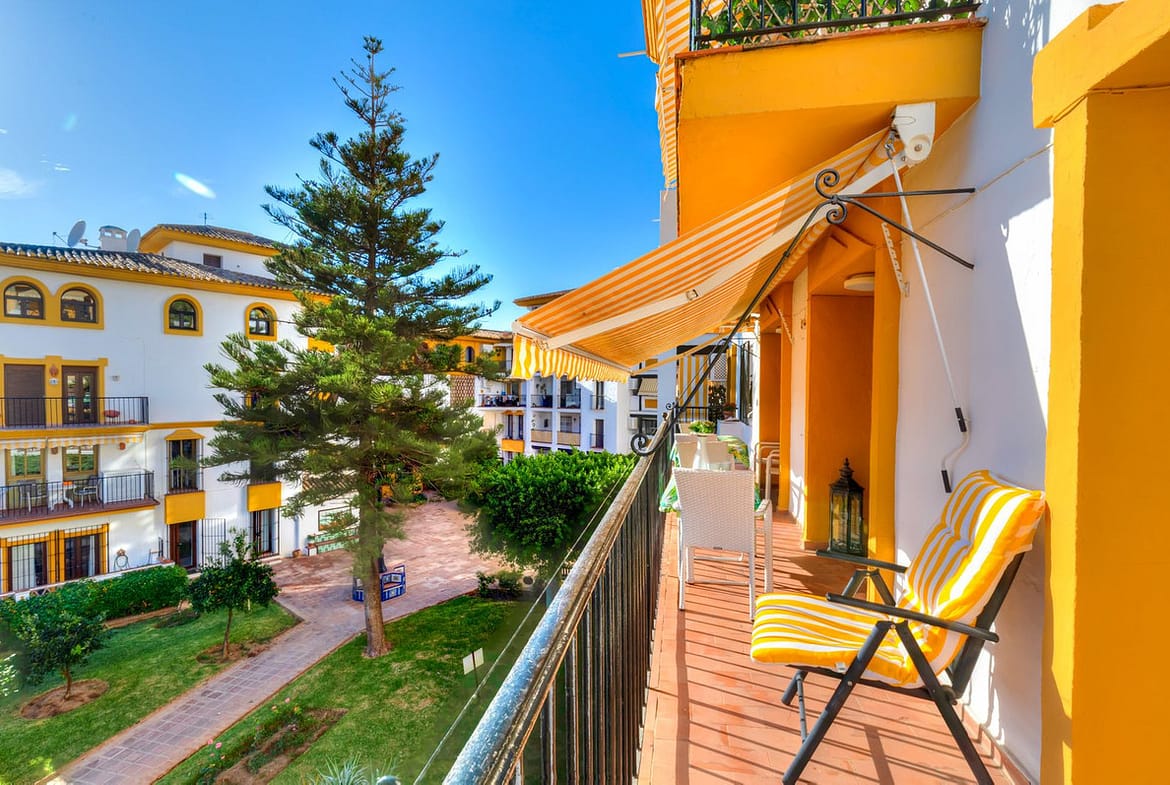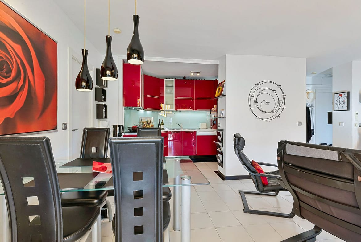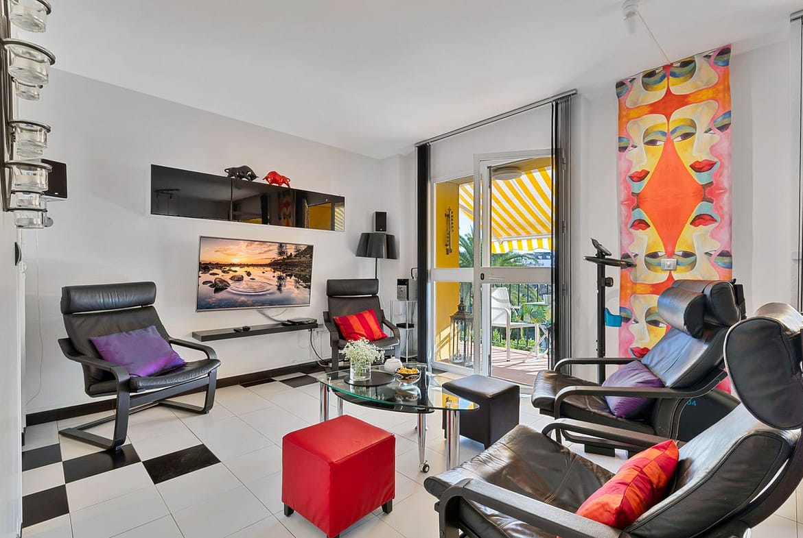 Air conditioning is available in the living room and both bedrooms. The apartment is sold furnished.