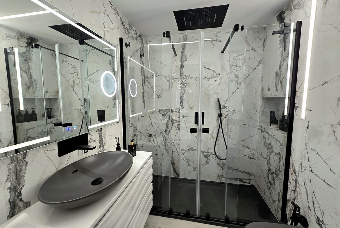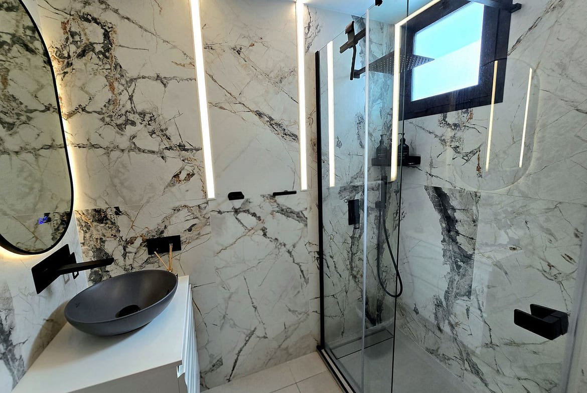 Impressive solarium on the upper floor, featuring a full bathroom and outdoor shower, perfect as an exclusive chill-out area.