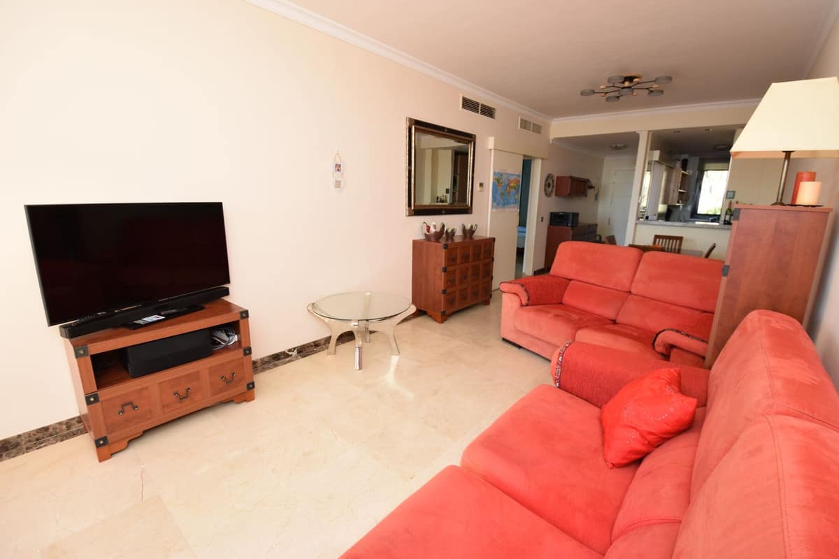 We are excited to showcase this charming middle floor apartment situated in the prestigious Calanova Sea Golf development (Mijas Costa). Constructed in 2006 and maintained in superb condition, this property spans 112m² in total and features a spacious living-dining area, a separate equipped kitchen, two double bedrooms with built-in wardrobes, and two full bathrooms (one being en suite). A highlight is the expansive double-aspect terrace, perfect for taking in the lovely weather throughout the year. Additional amenities include centralized hot/cold air conditioning, marble flooring, and plenty of natural light. The price also covers a subterranean parking spot and a storage unit. The community offers five swimming pools, well-kept gardens, and a tranquil ambiance, just a few minutes away from the Calanova golf course and the beach.