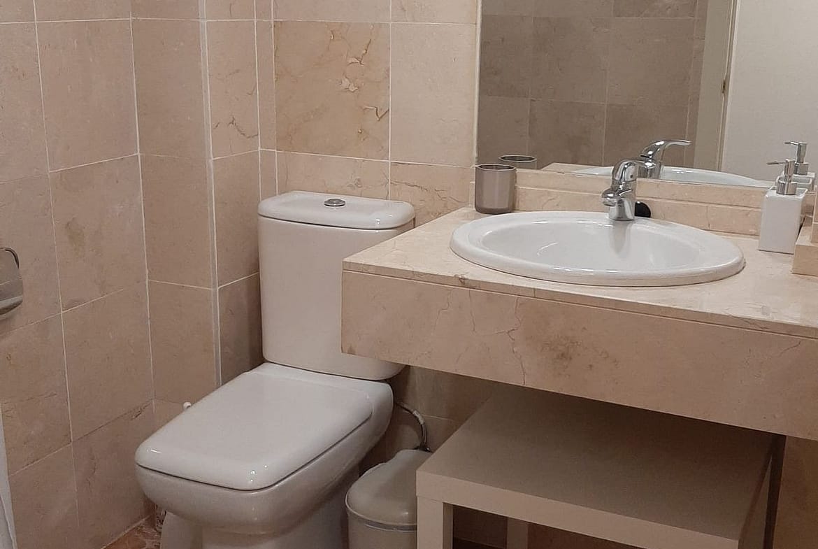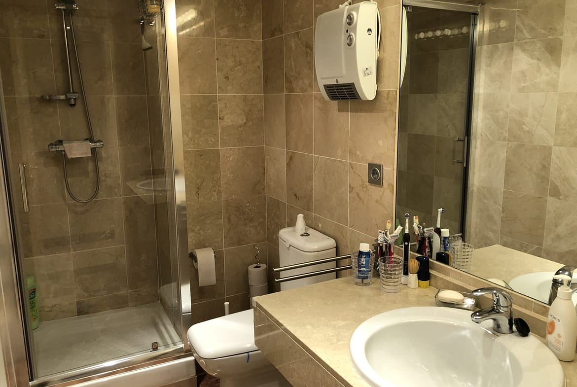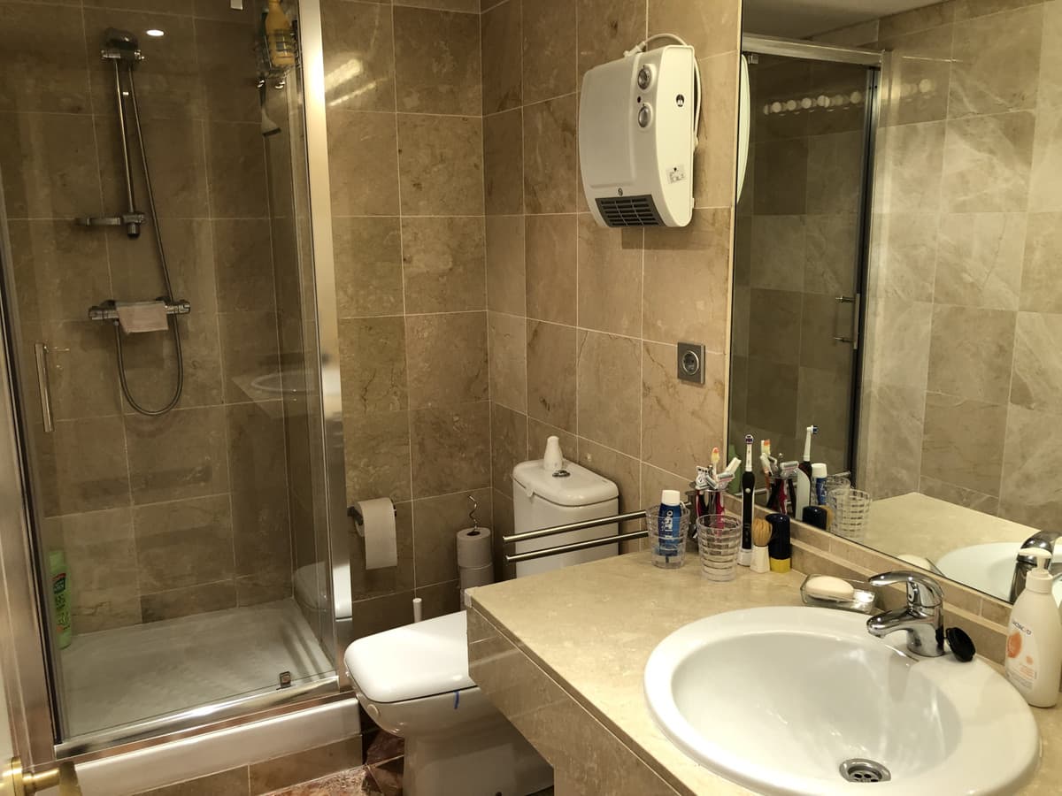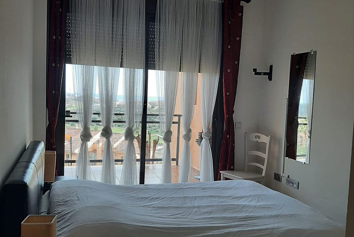 Elevated ground floor apartment with fantastic sea views. 2 beds and 2 baths (one of them en suite) located in the luxurious front line golf urbanization, Calanova Sea Golf. Spacious bedrooms have large built-in wardrobe, there is also a large wardrobe in the wide hallway between the two bedrooms that separates the sleeping area from the kitchen and the living room.