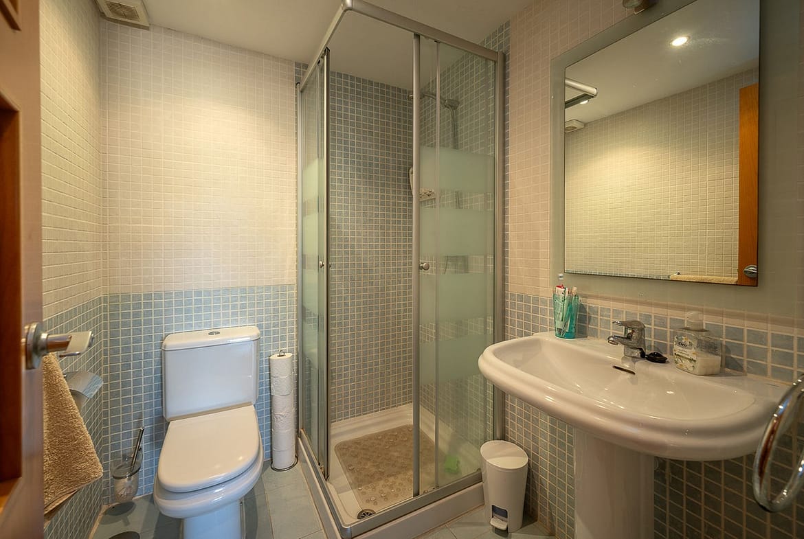 The main floor features a spacious and bright living-dining room with access to a private terrace leading up to the solarium, a fully equipped modern kitchen, and a guest toilet. The lower level comprises two double bedrooms and two full bathrooms, one of them en suite.