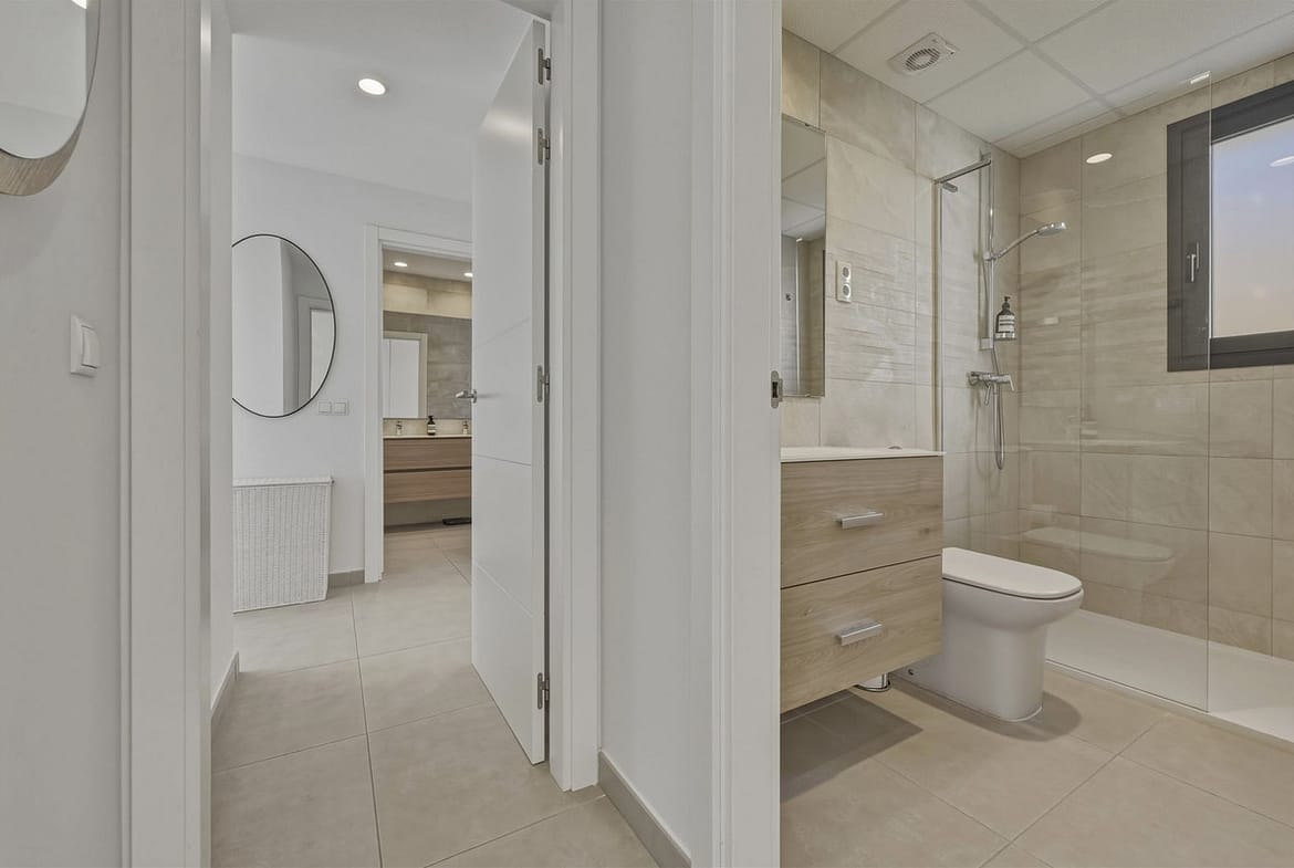 Bedrooms with Direct Terrace Access – The master suite enjoys direct access to the main terrace, allowing the panoramic golf views to be appreciated from both inside and out. The en-suite bathroom is spacious and contemporary, featuring a walk-in shower and double vanity. The second bedroom also benefits from direct terrace access and the same beautiful outlook, making it ideal for guests or family. A second modern bathroom with walk-in shower completes the accommodation.