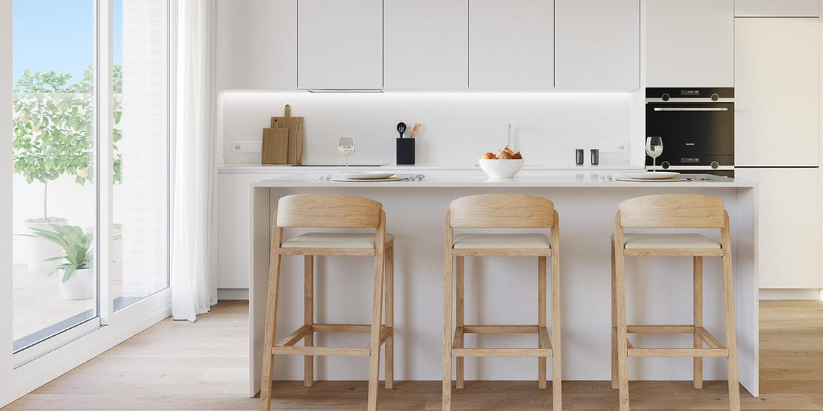 This project seeks to maximize the connection of the buildings with the beauty of the outdoors. For this reason, the team, together with Herrero-Osborne Arquitectos, have designed a building with large terraces with continuous glass railings and large windows that take full advantage of natural light and stand out against the white of the building, creating an elegant and modern design.