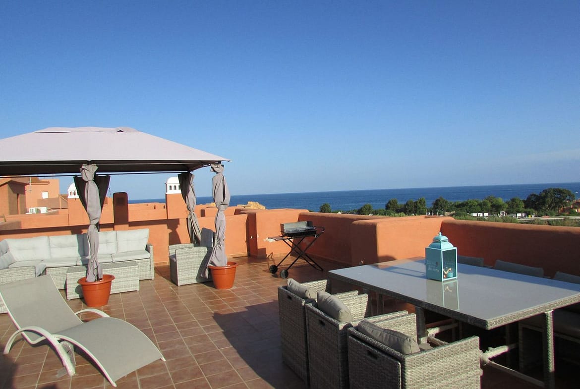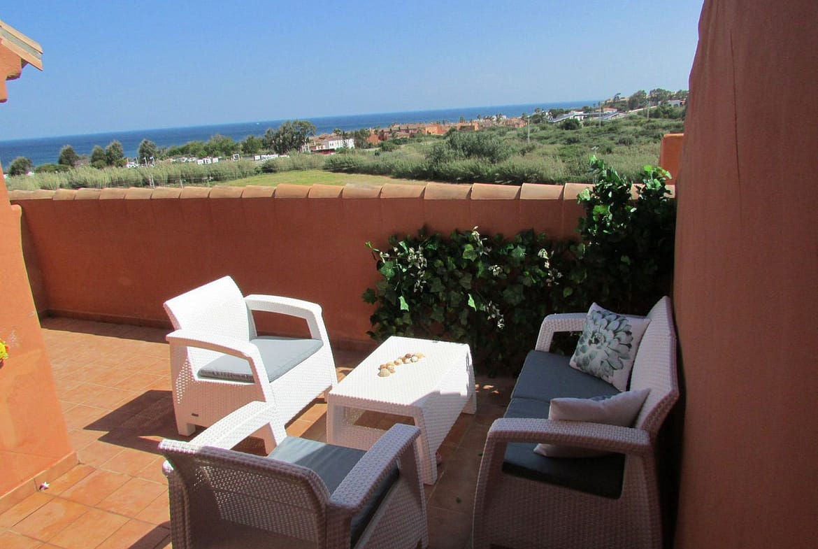 This beautifully presented 2-bedroom, 2.5-bathroom apartment is located in the peaceful and picturesque area of La Duquesa, just 500 meters from the beach and around 45 kilometers from the renowned town of Marbella. From the moment you step onto the impressive 111 m² terrace, you're greeted by stunning, uninterrupted views of the Mediterranean Sea. Directly in front of the property lies a protected vineyard of the famous Manilva Moscatel grape — a unique and natural landscape that guarantees your sea view will remain forever unobstructed.