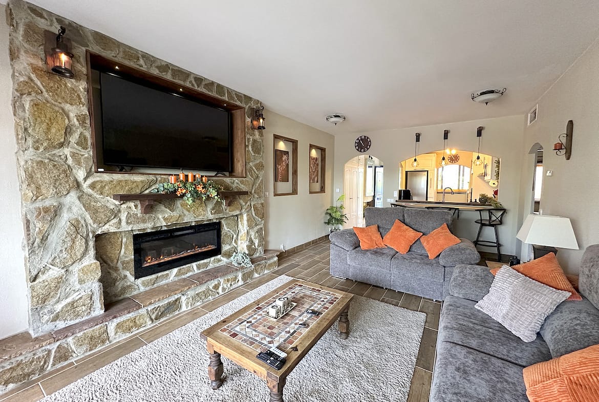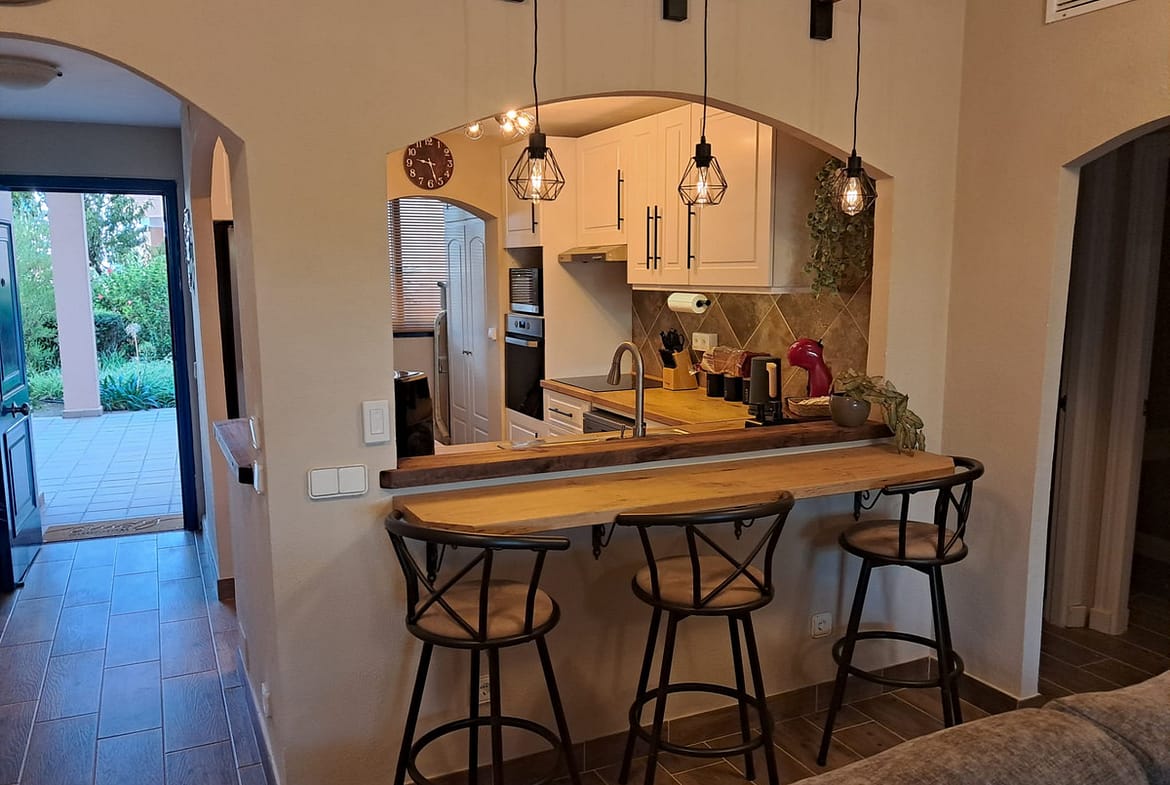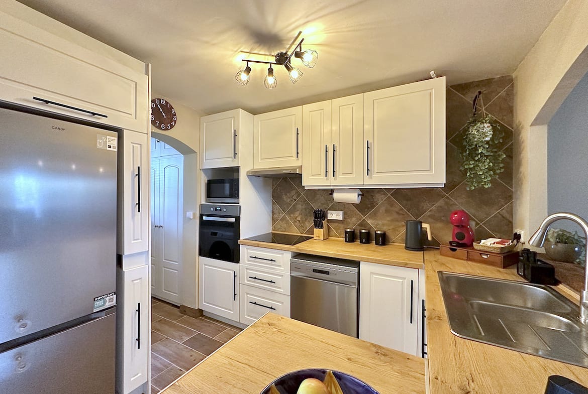 The apartment comprises two well-proportioned bedrooms and two modern bathrooms, including a stylish en-suite, as well as a guest toilet for added convenience. The open plan, fully fitted kitchen is equipped with high-quality appliances and is complemented by a separate utility and laundry room. The dining area flows seamlessly into the living space, which features a welcoming fireplace and direct access to the covered terrace, ideal for alfresco dining or relaxing in the Mediterranean climate. The property is offered fully furnished, with optional furniture packages available, and is in excellent, recently renovated condition.