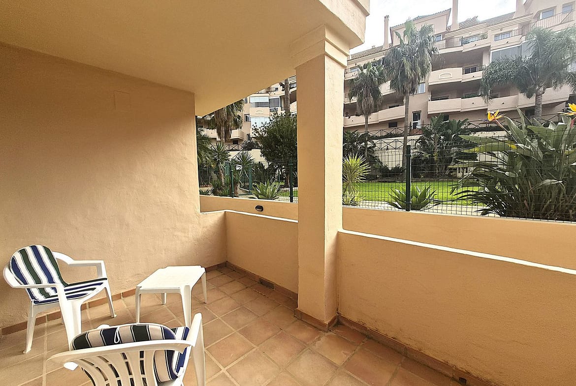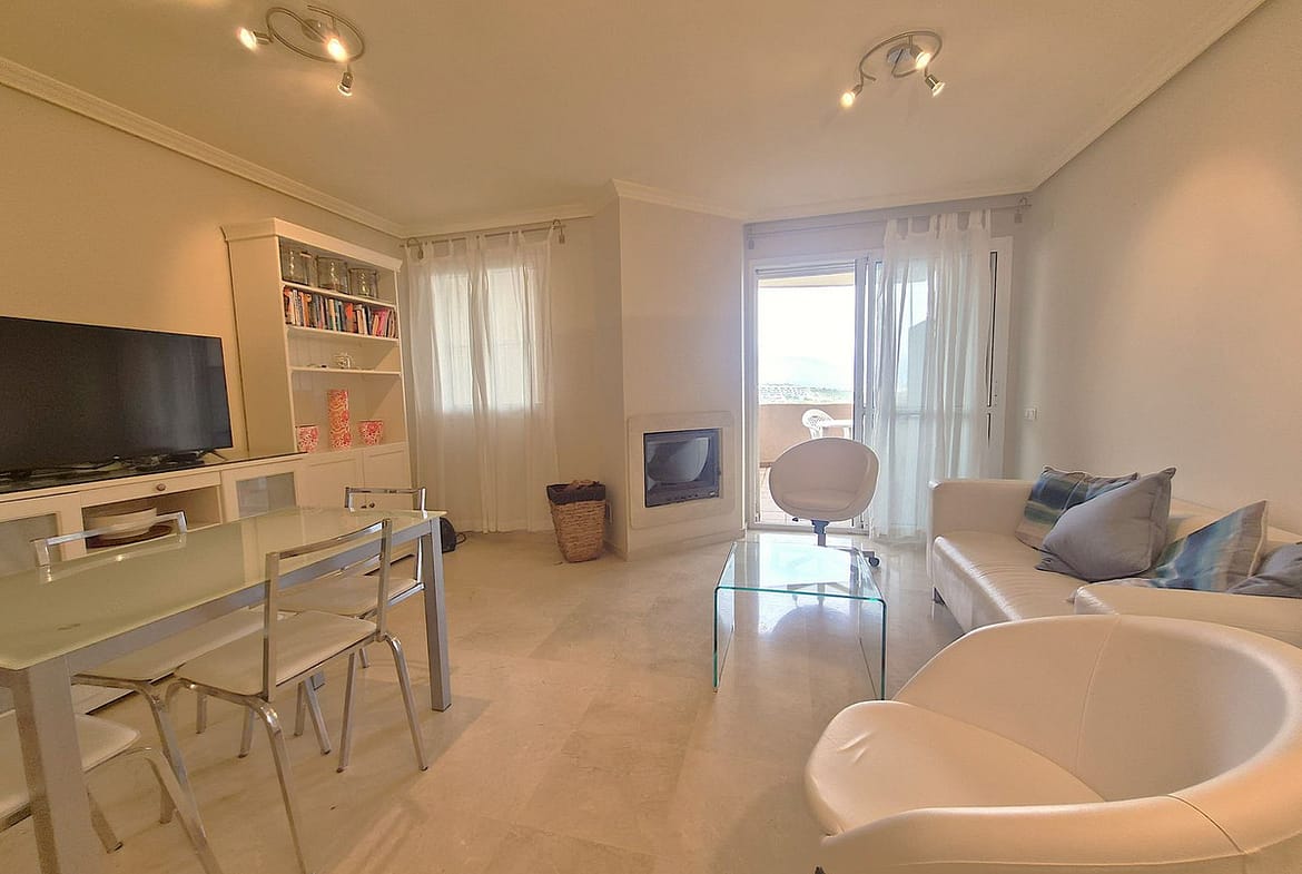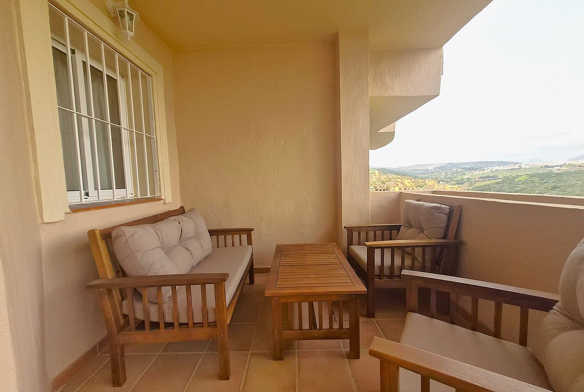 The main terrace, accessed directly from the living room, provides the perfect setting for outdoor dining and entertaining. With ample space for a table, chairs, and sun loungers, it’s an ideal spot to relax with family and friends, enjoy al fresco meals, or simply unwind in the sunshine and take in the beautiful views over Duquesa Golf. Its convenient connection to the living area creates a natural extension of the indoor space, perfect for year-round living.