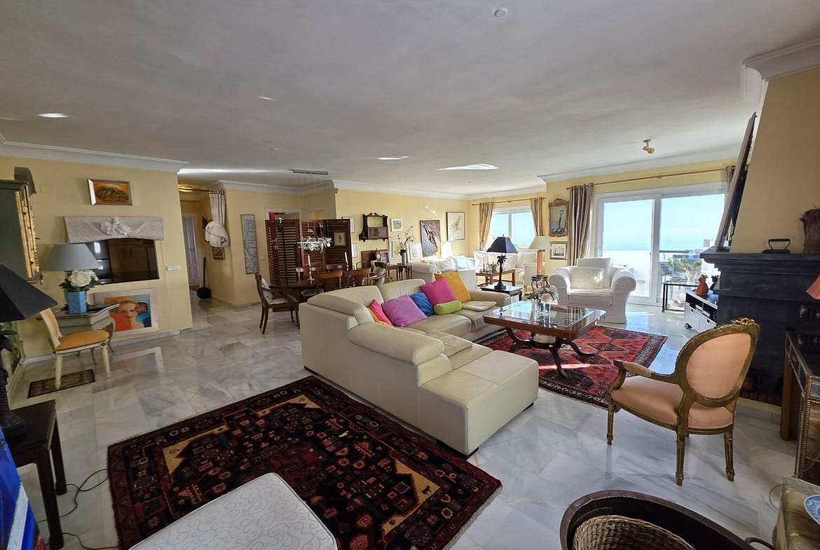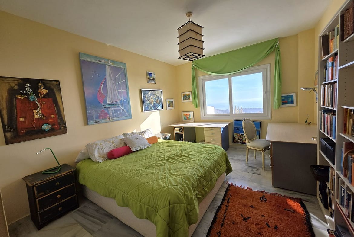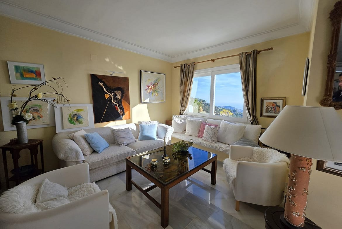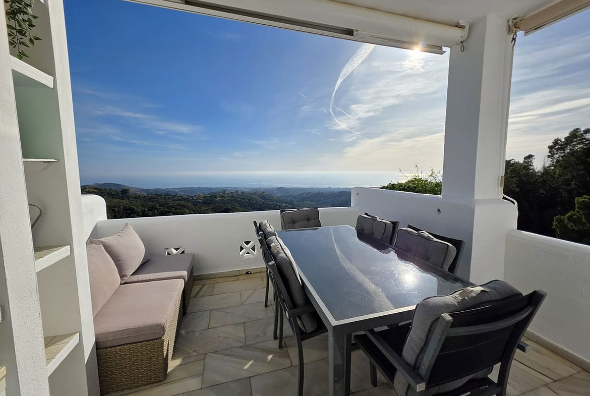 This stunning south facing apartment lies on the hills of Elviria, La Mairena and enjoys probably some of the most breath-taking views on the coast, with a panoramic vista that stretches across the Mediterranean to Gibraltar and Africa. As the best unit in this small, intimate complex, it benefits from no neighbours on the right and on the left, ensuring utmost privacy. The apartment boasts an open living and dining area, complete with a fireplace, that extends out to a sun-filled terrace with spectacular sea views stretching all the way to the coast of Morocco. Fully equipped spacious kitchen. There are 2 generous bedrooms and 2 bathrooms, including the very spacious master suite, with its beautiful bathroom, walk-in wardrobe and private balcony.
