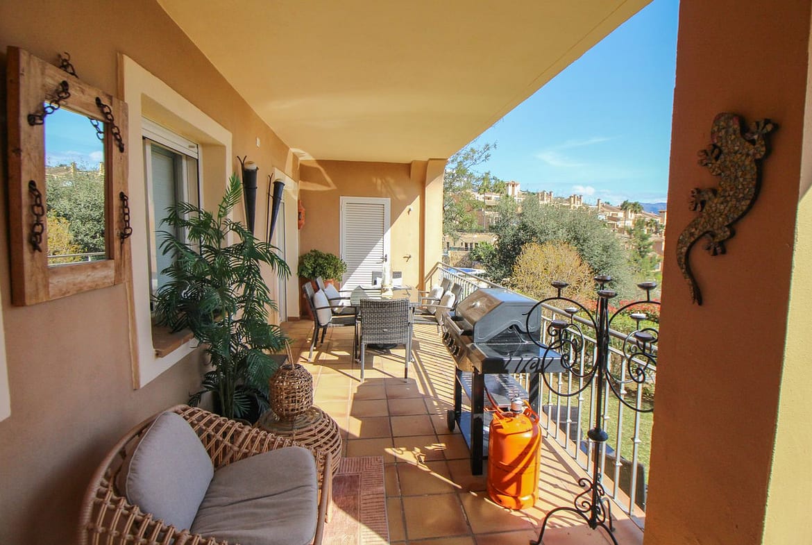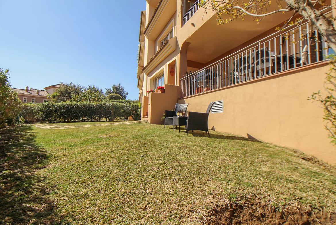 This spacious and well-maintained two-bedroom ground floor apartment, featuring a private terrace and 97m² private garden, offers a peaceful retreat in the prestigious La Mairena area. Nestled in the foothills of the Sierra de las Nieves — a designated UNESCO Biosphere Reserve — the property enjoys a privileged natural setting just above Elviria. The area is renowned for its panoramic Mediterranean views, cork oak forests, and tranquil, nature-focused atmosphere. Upon entering, you are welcomed by an entrance hall leading into a bright and generously proportioned living and dining area, complete with a cosy fireplace and direct access to the private terrace and garden — ideal for relaxed outdoor living. The fully equipped kitchen is complemented by a separate laundry and storage room, providing excellent practicality and additional space for organisation and kitchen storage. The master bedroom is spacious and benefits from direct terrace access, a dedicated walkin wardrobe, and a large en-suite bathroom fitted with both a bathtub and walk-in shower. The second double bedroom is also well sized and includes built-in wardrobes. The layout is completed with good sized guest bathroom with large shower. Finished to a high standard throughout, the apartment features cream marble flooring, air conditioning, double glazing, and shutters in the living room and bedrooms for privacy and climate control. The property also includes private parking and a storage room, ensuring both convenience and peace of mind. Set within the exclusive gated community of El Vicario, residents enjoy beautifully landscaped gardens, three communal swimming pools, and a paddle tennis court, all surrounded by lush greenery. This tranquil development comprises approximately 110 luxury apartments arranged across three phases. Local amenities in La Mairena include a mini-market, restaurants, a bar, and the renowned Hofsass Tennis Academy. The area is also home to respected international schools such as Juan Hoffmann German School and Ecos School.